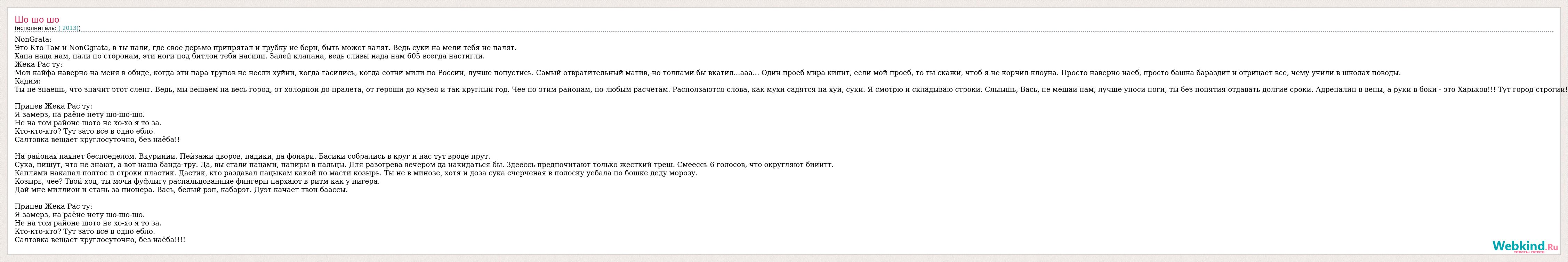NonGrata: Это Кто Там и NonGgrata, в ты пали, где свое дерьмо припрятал и трубку не бери, быть может валят. Ведь суки на мели тебя не палят. Хапа нада нам, пали по сторонам, эти ноги под битлон тебя насили. Залей клапана, ведь сливы нада нам 605 всегда настигли. Жека Рас ту: Мои кайфа наверно на меня в обиде, когда эти пара трупов не несли хуйни, когда гасились, когда сотни мили по России, лучше попустись. Самый отвратительный матив, но толпами бы вкатил...ааа... Один проеб мира кипит, если мой проеб, то ты скажи, чтоб я не корчил клоуна. Просто наверно наеб, просто башка бараздит и отрицает все, чему учили в школах поводы. Кадим: Ты не знаешь, что значит этот сленг. Ведь, мы вещаем на весь город, от холодной до пралета, от героши до музея и так круглый год. Чее по этим районам, по любым расчетам. Расползаются слова, как мухи садятся на хуй, суки. Я смотрю и складываю строки. Слыышь, Вась, не мешай нам, лучше уноси ноги, ты без понятия отдавать долгие сроки. Адреналин в вены, а руки в боки - это Харьков!!! Тут город строгий! Припев Жека Рас ту: Я замерз, на раёне нету шо-шо-шо. Не на том районе шото не хо-хо я то за. Кто-кто-кто? Тут зато все в одно ебло. Салтовка вещает круглосуточно, без наёба!! На районах пахнет беспоеделом. Вкурииии. Пейзажи дворов, падики, да фонари. Басики собрались в круг и нас тут вроде прут. Сука, пишут, что не знают, а вот наша банда-тру. Да, вы стали пацами, папиры в пальцы. Для разогрева вечером да накидаться бы. Здеессь предпочитают только жесткий треш. Смеессь 6 голосов, что округляют бииитт. Каплями накапал полтос и строки пластик. Дастик, кто раздавал пацыкам какой по масти козырь. Ты не в минозе, хотя и доза сука счерченая в полоску уебала по бошке деду морозу. Козырь, чее? Твой ход, ты мочи фуфлыгу распальцованные фингеры пархают в ритм как у нигера. Дай мне миллион и стань за пионера. Вась, белый рэп, кабарэт. Дуэт качает твои баассы. Припев Жека Рас ту: Я замерз, на раёне нету шо-шо-шо. Не на том районе шото не хо-хо я то за. Кто-кто-кто? Тут зато все в одно ебло. Салтовка вещает круглосуточно, без наёба!!!!