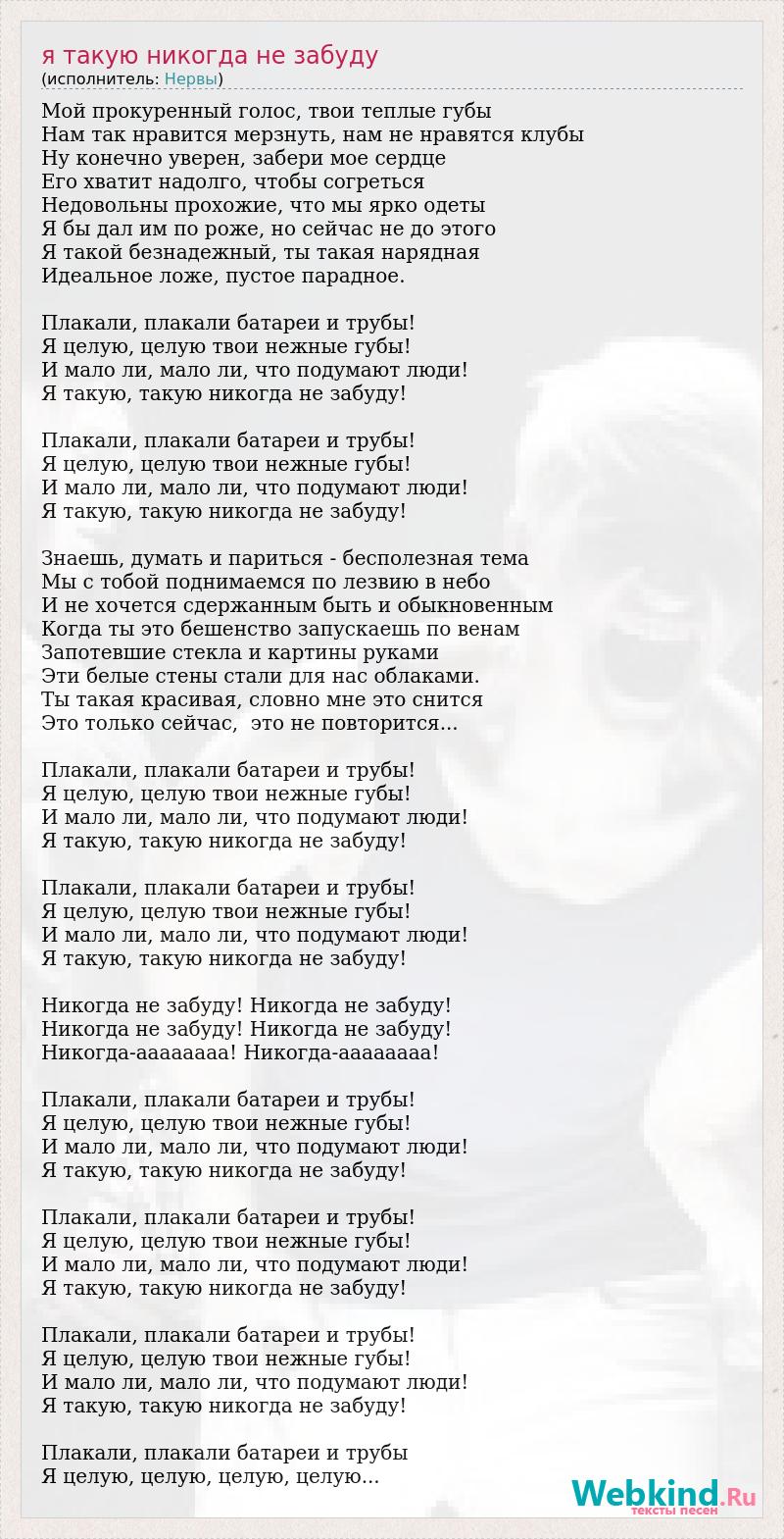 Мой прокуренный голос, твои теплые губы Нам так нравится мерзнуть, нам не нравятся клубы Ну конечно уверен, забери мое сердце Его хватит надолго, чтобы согреться Недовольны прохожие, что мы ярко одеты Я бы дал им по роже, но сейчас не до этого Я такой безнадежный, ты такая нарядная Идеальное ложе, пустое парадное. Плакали, плакали батареи и трубы! Я целую, целую твои нежные губы! И мало ли, мало ли, что подумают люди! Я такую, такую никогда не забуду! Плакали, плакали батареи и трубы! Я целую, целую твои нежные губы! И мало ли, мало ли, что подумают люди! Я такую, такую никогда не забуду! Знаешь, думать и париться - бесполезная тема Мы с тобой поднимаемся по лезвию в небо И не хочется сдержанным быть и обыкновенным Когда ты это бешенство запускаешь по венам Запотевшие стекла и картины руками Эти белые стены стали для нас облаками. Ты такая красивая, словно мне это снится Это только сейчас, это не повторится... Плакали, плакали батареи и трубы! Я целую, целую твои нежные губы! И мало ли, мало ли, что подумают люди! Я такую, такую никогда не забуду! Плакали, плакали батареи и трубы! Я целую, целую твои нежные губы! И мало ли, мало ли, что подумают люди! Я такую, такую никогда не забуду! Никогда не забуду! Никогда не забуду! Никогда не забуду! Никогда не забуду! Никогда-аааааааа! Никогда-аааааааа! Плакали, плакали батареи и трубы! Я целую, целую твои нежные губы! И мало ли, мало ли, что подумают люди! Я такую, такую никогда не забуду! Плакали, плакали батареи и трубы! Я целую, целую твои нежные губы! И мало ли, мало ли, что подумают люди! Я такую, такую никогда не забуду! Плакали, плакали батареи и трубы! Я целую, целую твои нежные губы! И мало ли, мало ли, что подумают люди! Я такую, такую никогда не забуду! Плакали, плакали батареи и трубы Я целую, целую, целую, целую...