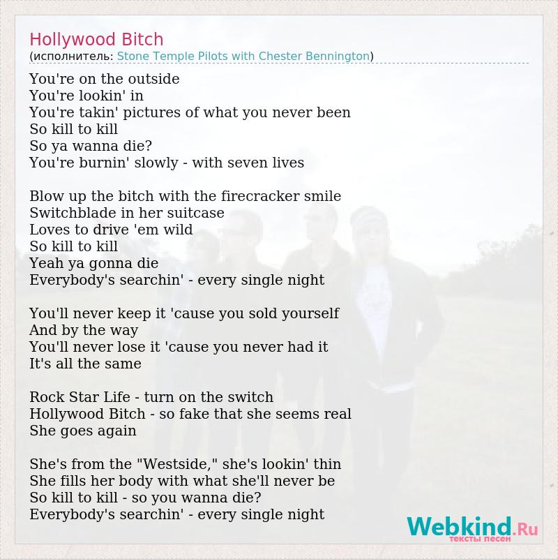 You're on the outside You're lookin' in You're takin' pictures of what you never been So kill to kill So ya wanna die? You're burnin' slowly - with seven lives Blow up the bitch with the firecracker smile Switchblade in her suitcase Loves to drive 'em wild So kill to kill Yeah ya gonna die Everybody's searchin' - every single night You'll never keep it 'cause you sold yourself And by the way You'll never lose it 'cause you never had it It's all the same Rock Star Life - turn on the switch Hollywood Bitch - so fake that she seems real She goes again She's from the "Westside," she's lookin' thin She fills her body with what she'll never be So kill to kill - so you wanna die? Everybody's searchin' - every single night