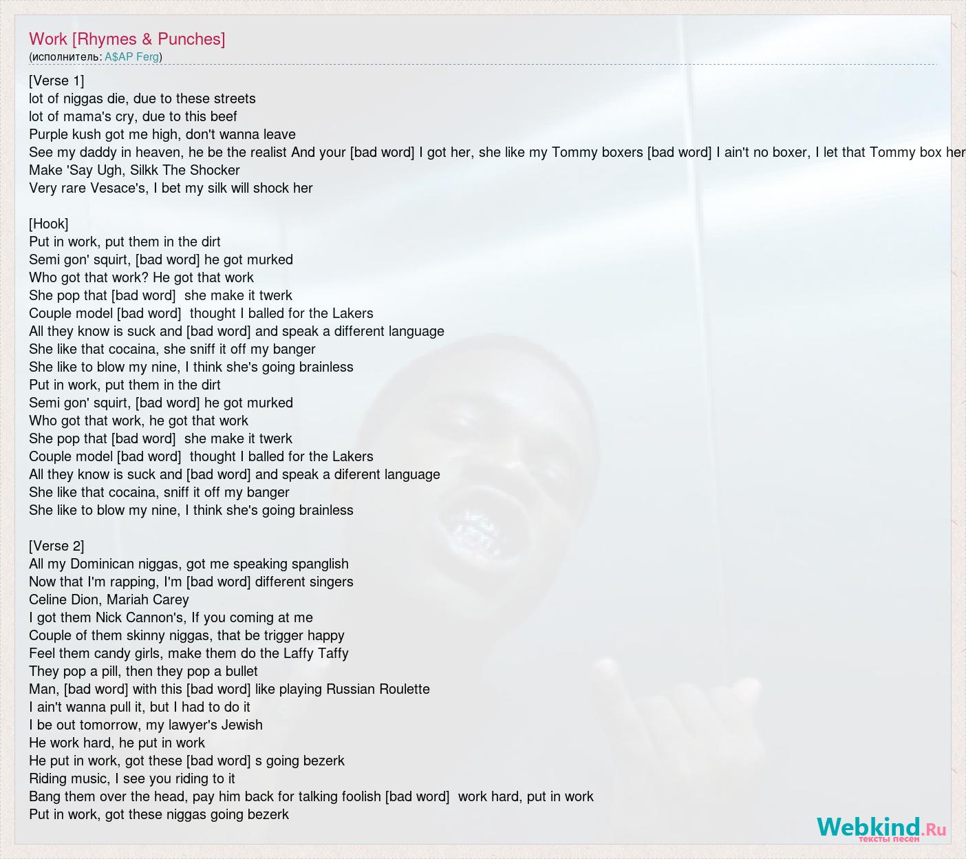 [Verse 1] lot of niggas die, due to these streets lot of mama's cry, due to this beef Purple kush got me high, don't wanna leave See my daddy in heaven, he be the realist And your [bad word] I got her, she like my Tommy boxers [bad word] I ain't no boxer, I let that Tommy box her Make 'Say Ugh, Silkk The Shocker Very rare Vesace's, I bet my silk will shock her [Hook] Put in work, put them in the dirt Semi gon' squirt, [bad word] he got murked Who got that work? He got that work She pop that [bad word] she make it twerk Couple model [bad word] thought I balled for the Lakers All they know is suck and [bad word] and speak a different language She like that cocaina, she sniff it off my banger She like to blow my nine, I think she's going brainless Put in work, put them in the dirt Semi gon' squirt, [bad word] he got murked Who got that work, he got that work She pop that [bad word] she make it twerk Couple model [bad word] thought I balled for the Lakers All they know is suck and [bad word] and speak a diferent language She like that cocaina, sniff it off my banger She like to blow my nine, I think she's going brainless [Verse 2] All my Dominican niggas, got me speaking spanglish Now that I'm rapping, I'm [bad word] different singers Celine Dion, Mariah Carey I got them Nick Cannon's, If you coming at me Couple of them skinny niggas, that be trigger happy Feel them candy girls, make them do the Laffy Taffy They pop a pill, then they pop a bullet Man, [bad word] with this [bad word] like playing Russian Roulette I ain't wanna pull it, but I had to do it I be out tomorrow, my lawyer's Jewish He work hard, he put in work He put in work, got these [bad word] s going bezerk Riding music, I see you riding to it Bang them over the head, pay him back for talking foolish [bad word] work hard, put in work Put in work, got these niggas going bezerk