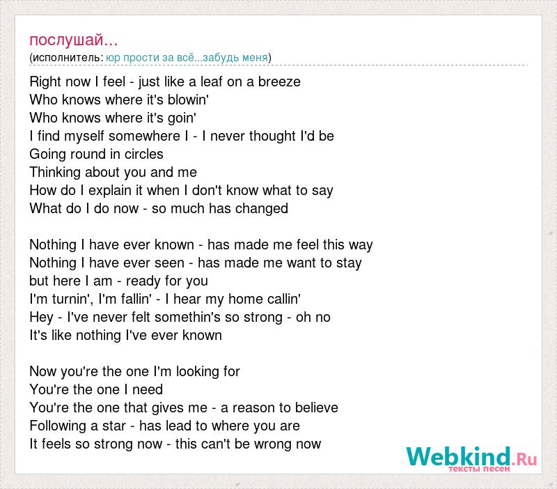 Right now I feel - just like a leaf on a breeze Who knows where it's blowin' Who knows where it's goin' I find myself somewhere I - I never thought I'd be Going round in circles Thinking about you and me How do I explain it when I don't know what to say What do I do now - so much has changed Nothing I have ever known - has made me feel this way Nothing I have ever seen - has made me want to stay but here I am - ready for you I'm turnin', I'm fallin' - I hear my home callin' Hey - I've never felt somethin's so strong - oh no It's like nothing I've ever known Now you're the one I'm looking for You're the one I need You're the one that gives me - a reason to believe Following a star - has lead to where you are It feels so strong now - this can't be wrong now