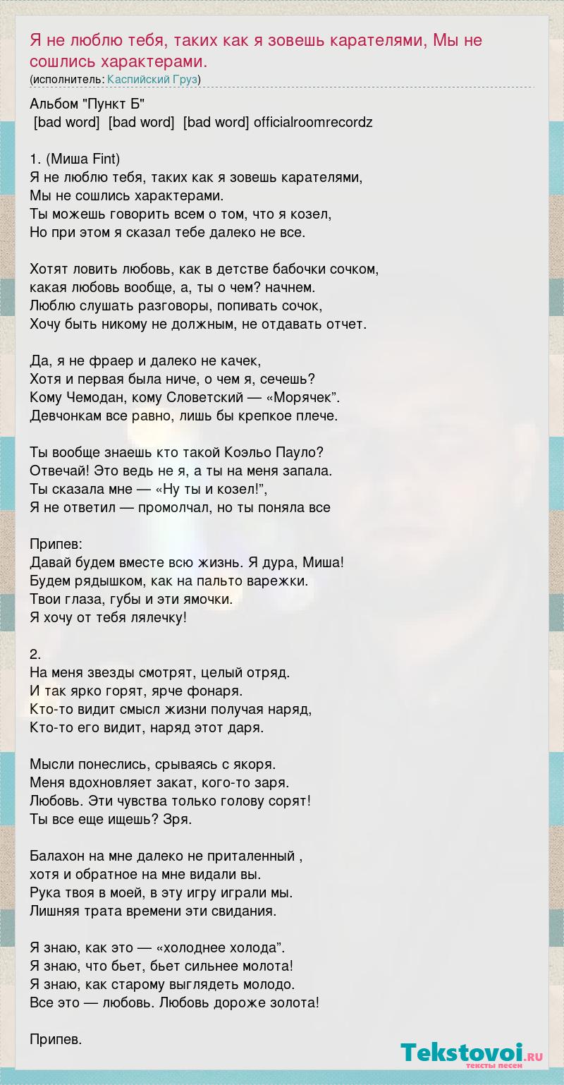 Альбом "Пункт Б" [bad word] [bad word] [bad word] officialroomrecordz 1. (Миша Fint) Я не люблю тебя, таких как я зовешь карателями, Мы не сошлись характерами. Ты можешь говорить всем о том, что я козел, Но при этом я сказал тебе далеко не все. Хотят ловить любовь, как в детстве бабочки сочком, какая любовь вообще, а, ты о чем? начнем. Люблю слушать разговоры, попивать сочок, Хочу быть никому не должным, не отдавать отчет. Да, я не фраер и далеко не качек, Хотя и первая была ниче, о чем я, сечешь? Кому Чемодан, кому Словетский — «Морячек”. Девчонкам все равно, лишь бы крепкое плече. Ты вообще знаешь кто такой Коэльо Пауло? Отвечай! Это ведь не я, а ты на меня запала. Ты сказала мне — «Ну ты и козел!”, Я не ответил — промолчал, но ты поняла все Припев: Давай будем вместе всю жизнь. Я дура, Миша! Будем рядышком, как на пальто варежки. Твои глаза, губы и эти ямочки. Я хочу от тебя лялечку! 2. На меня звезды смотрят, целый отряд. И так ярко горят, ярче фонаря. Кто-то видит смысл жизни получая наряд, Кто-то его видит, наряд этот даря. Мысли понеслись, срываясь с якоря. Меня вдохновляет закат, кого-то заря. Любовь. Эти чувства только голову сорят! Ты все еще ищешь? Зря. Балахон на мне далеко не приталенный , хотя и обратное на мне видали вы. Рука твоя в моей, в эту игру играли мы. Лишняя трата времени эти свидания. Я знаю, как это — «холоднее холода”. Я знаю, что бьет, бьет сильнее молота! Я знаю, как старому выглядеть молодо. Все это — любовь. Любовь дороже золота! Припев.