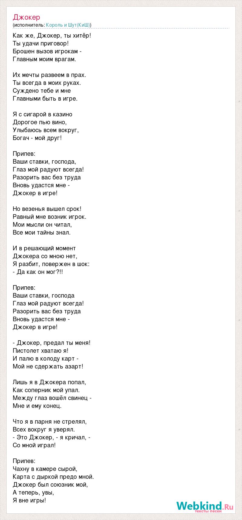 Как же, Джокер, ты хитёр! Ты удачи приговор! Брошен вызов игрокам - Главным моим врагам. Их мечты развеем в прах. Ты всегда в моих руках. Суждено тебе и мне Главными быть в игре. Я с сигарой в казино Дорогое пью вино, Улыбаюсь всем вокруг, Богач - мой друг! Припев: Ваши ставки, господа, Глаз мой радуют всегда! Разорить вас без труда Вновь удастся мне - Джокер в игре! Но везенья вышел срок! Равный мне возник игрок. Мои мысли он читал, Все мои тайны знал. И в решающий момент Джокера со мною нет, Я разбит, повержен в шок: - Да как он мог?!! Припев: Ваши ставки, господа Глаз мой радуют всегда! Разорить вас без труда Вновь удастся мне - Джокер в игре! - Джокер, предал ты меня! Пистолет хватаю я! И палю в колоду карт - Мой не сдержать азарт! Лишь я в Джокера попал, Как соперник мой упал. Между глаз вошёл свинец - Мне и ему конец. Что я в парня не стрелял, Всех вокруг я уверял. - Это Джокер, - я кричал, - Со мной играл! Припев: Чахну в камере сырой, Карта с дыркой предо мной. Джокер был союзник мой, А теперь, увы, Я вне игры!