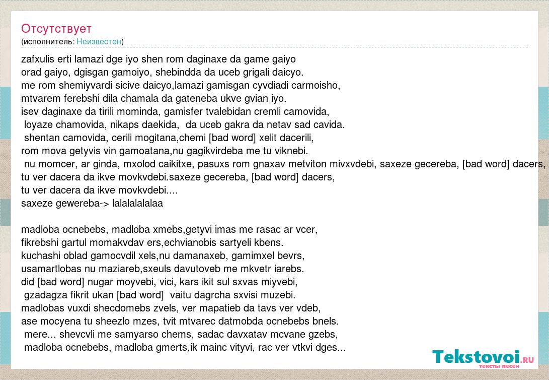 zafxulis erti lamazi dge iyo shen rom daginaxe da game gaiyo orad gaiyo, dgisgan gamoiyo, shebindda da uceb grigali daicyo. me rom shemiyvardi sicive daicyo,lamazi gamisgan cyvdiadi carmoisho, mtvarem ferebshi dila chamala da gateneba ukve gvian iyo. isev daginaxe da tirili mominda, gamisfer tvalebidan cremli camovida, loyaze chamovida, nikaps daekida, da uceb gakra da netav sad cavida. shentan camovida, cerili mogitana,chemi siyvarulis xelit dacerili, rom mova getyvis vin gamoatana,nu gagikvirdeba me tu viknebi. nu momcer, ar ginda, mxolod caikitxe, pasuxs rom gnaxav metviton mivxvdebi, saxeze gecereba, siyvaruli dacers, tu ver dacera da ikve movkvdebi.saxeze gecereba, siyvaruli dacers, tu ver dacera da ikve movkvdebi.... saxeze gewereba-> lalalalalalaa madloba ocnebebs, madloba xmebs,getyvi imas me rasac ar vcer, fikrebshi gartul momakvdav ers,echvianobis sartyeli kbens. kuchashi oblad gamocvdil xels,nu damanaxeb, gamimxel bevrs, usamartlobas nu maziareb,sxeuls davutoveb me mkvetr iarebs. did siyvarulze nugar moyvebi, vici, kars ikit sul sxvas miyvebi, gzadagza fikrit ukan brundebi, vaitu dagrcha sxvisi muzebi. madlobas vuxdi shecdomebs zvels, ver mapatieb da tavs ver vdeb, ase mocyena tu sheezlo mzes, tvit mtvarec datmobda ocnebebs bnels. mere... shevcvli me samyarso chems, sadac davxatav mcvane gzebs, madloba ocnebebs, madloba gmerts,ik mainc vityvi, rac ver vtkvi dges...
