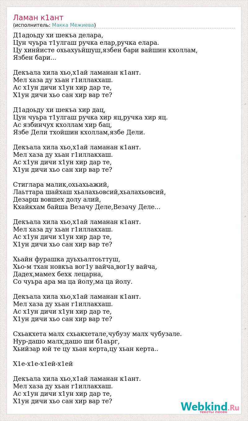 Д1адоьду хи шекъа делара, Цун чуьра т1улгаш ручка елар,ручка елара. Цу хинйисте охьахуьйшуш,язбен бари вайшин кхоллам, Язбен бари... Декъала хила хьо,х1ай ламанан к1ант. Мел хаза ду хьан г1иллакхаш. Ас х1ун дичи х1ун хир дар те, Х1ун дичи хьо сан хир вар те? Д1адоьду хи шекъа хир дац, Цун чуьра т1улгаш ручка хир яц,ручка хир яц. Ас язбинчух кхоллам хир бац, Язбе Дели тхойшин кхоллам,язбе Дели. Декъала хила хьо,х1ай ламанан к1ант. Мел хаза ду хьан г1иллакхаш. Ас х1ун дичи х1ун хир дар те, Х1ун дичи хьо сан хир вар те? Стиглара малик,охьахьажий, Лаьттара шайхаш хьалахьовсий,хьалахьовсий, Дезарш вовшех долу алий, Кхайкхам байша Везачу Деле,Везачу Деле... Декъала хила хьо,х1ай ламанан к1ант. Мел хаза ду хьан г1иллакхаш. Ас х1ун дичи х1ун хир дар те, Х1ун дичи хьо сан хир вар те? Хьайн фурашка дуьхьалтоьттуш, Хьо-м тхан новкъа вог1у вайча,вог1у вайча, Дадех,мамех бехк лецарна, Со чуьра ара ма ца йолу,ма ца йолу. Декъала хила хьо,х1ай ламанан к1ант. Мел хаза ду хьан г1иллакхаш. Ас х1ун дичи х1ун хир дар те, Х1ун дичи хьо сан хир вар те? Схьакхета малх схьакхетале,чубузу малх чубузале. Нур-дашо малх,дашо ши б1аьрг, Хьийзар юй те цу хьан керта,цу хьан керта.. Х1е-х1е-х1ей-х1ей Декъала хила хьо,х1ай ламанан к1ант. Мел хаза ду хьан г1иллакхаш. Ас х1ун дичи х1ун хир дар те, Х1ун дичи хьо сан хир вар те?