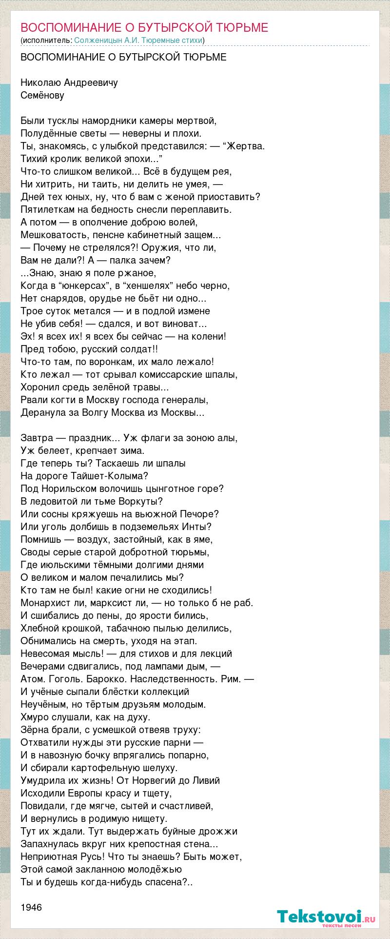 ВОСПОМИНАНИЕ О БУТЫРСКОЙ ТЮРЬМЕ Николаю Андреевичу Семёнову Были тусклы намордники камеры мертвой, Полудённые светы — неверны и плохи. Ты, знакомясь, с улыбкой представился: — “Жертва. Тихий кролик великой эпохи...” Что-то слишком великой... Всё в будущем рея, Ни хитрить, ни таить, ни делить не умея, — Дней тех юных, ну, что б вам с женой приоставить? Пятилеткам на бедность снесли переплавить. А потом — в ополчение доброю волей, Мешковатость, пенсне кабинетный защем... — Почему не стрелялся?! Оружия, что ли, Вам не дали?! А — палка зачем? ...Знаю, знаю я поле ржаное, Когда в “юнкерсах”, в “хеншелях” небо черно, Нет снарядов, орудье не бьёт ни одно... Трое суток метался — и в подлой измене Не убив себя! — сдался, и вот виноват... Эх! я всех их! я всех бы сейчас — на колени! Пред тобою, русский солдат!! Что-то там, по воронкам, их мало лежало! Кто лежал — тот срывал комиссарские шпалы, Хоронил средь зелёной травы... Рвали когти в Москву господа генералы, Деранула за Волгу Москва из Москвы... Завтра — праздник... Уж флаги за зоною алы, Уж белеет, крепчает зима. Где теперь ты? Таскаешь ли шпалы На дороге Тайшет-Колыма? Под Норильском волочишь цынготное горе? В ледовитой ли тьме Воркуты? Или сосны кряжуешь на вьюжной Печоре? Или уголь долбишь в подземельях Инты? Помнишь — воздух, застойный, как в яме, Своды серые старой добротной тюрьмы, Где июльскими тёмными долгими днями О великом и малом печалились мы? Кто там не был! какие огни не сходились! Монархист ли, марксист ли, — но только б не раб. И сшибались до пены, до ярости бились, Хлебной крошкой, табачною пылью делились, Обнимались на смерть, уходя на этап. Невесомая мысль! — для стихов и для лекций Вечерами сдвигались, под лампами дым, — Атом. Гоголь. Барокко. Наследственность. Рим. — И учёные сыпали блёстки коллекций Неучёным, но тёртым друзьям молодым. Хмуро слушали, как на духу. Зёрна брали, с усмешкой отвеяв труху: Отхватили нужды эти русские парни — И в навозную бочку впрягались попарно, И сбирали картофельную шелуху. Умудрила их жизнь! От Норвегий до Ливий Исходили Европы красу и тщету, Повидали, где мягче, сытей и счастливей, И вернулись в родимую нищету. Тут их ждали. Тут выдержать буйные дрожжи Запахнулась вкруг них крепостная стена... Неприютная Русь! Что ты знаешь? Быть может, Этой самой закланною молодёжью Ты и будешь когда-нибудь спасена?.. 1946