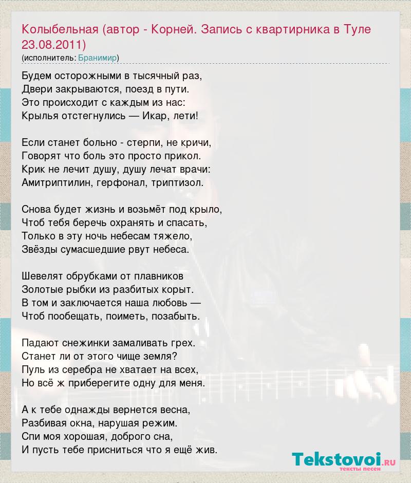 Будем осторожными в тысячный раз, Двери закрываются, поезд в пути. Это происходит с каждым из нас: Крылья отстегнулись — Икар, лети! Если станет больно - стерпи, не кричи, Говорят что боль это просто прикол. Крик не лечит душу, душу лечат врачи: Амитриптилин, герфонал, триптизол. Снова будет жизнь и возьмёт под крыло, Чтоб тебя беречь охранять и спасать, Только в эту ночь небесам тяжело, Звёзды сумасшедшие рвут небеса. Шевелят обрубками от плавников Золотые рыбки из разбитых корыт. В том и заключается наша любовь — Чтоб пообещать, поиметь, позабыть. Падают снежинки замаливать грех. Станет ли от этого чище земля? Пуль из серебра не хватает на всех, Но всё ж приберегите одну для меня. А к тебе однажды вернется весна, Разбивая окна, нарушая режим. Спи моя хорошая, доброго сна, И пусть тебе присниться что я ещё жив.