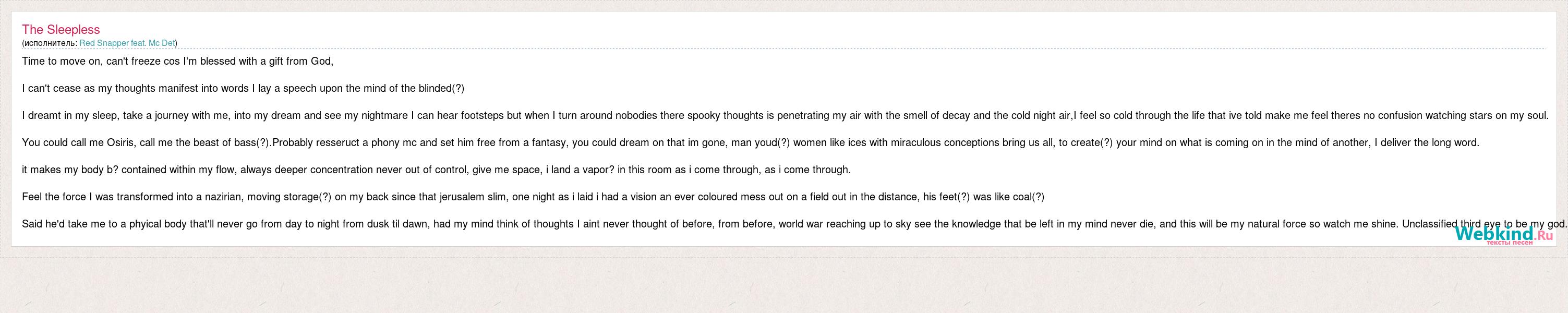 Time to move on, can't freeze cos I'm blessed with a gift from God, I can't cease as my thoughts manifest into words I lay a speech upon the mind of the blinded(?) I dreamt in my sleep, take a journey with me, into my dream and see my nightmare I can hear footsteps but when I turn around nobodies there spooky thoughts is penetrating my air with the smell of decay and the cold night air,I feel so cold through the life that ive told make me feel theres no confusion watching stars on my soul. You could call me Osiris, call me the beast of bass(?).Probably resseruct a phony mc and set him free from a fantasy, you could dream on that im gone, man youd(?) women like ices with miraculous conceptions bring us all, to create(?) your mind on what is coming on in the mind of another, I deliver the long word. it makes my body b? contained within my flow, always deeper concentration never out of control, give me space, i land a vapor? in this room as i come through, as i come through. Feel the force I was transformed into a nazirian, moving storage(?) on my back since that jerusalem slim, one night as i laid i had a vision an ever coloured mess out on a field out in the distance, his feet(?) was like coal(?) Said he'd take me to a phyical body that'll never go from day to night from dusk til dawn, had my mind think of thoughts I aint never thought of before, from before, world war reaching up to sky see the knowledge that be left in my mind never die, and this will be my natural force so watch me shine. Unclassified third eye to be my god.