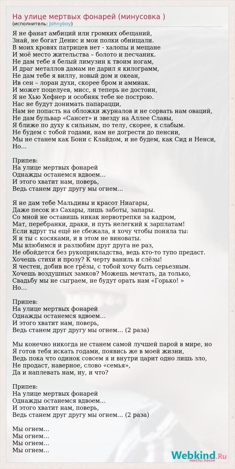 Я не фанат амбиций или громких обещаний, Знай, не богат Денис и мои полки обнищали. В моих кровях патрицев нет - халопы и мещане И моё место жительства – болото и песчаник. Не дам тебе я белый лимузин к твоим ногам, И драг металлов дамам не дарил я килограмм, Не дам тебе я виллу, новый дом и океан, Ив сен – лоран духи, скорее бром и аммиак. И может поцелуев, мисс, я теперь не достоин, Я не Хью Хефнер и особняк тебе не построю. Нас не будут донимать папарацци, Нам не попасть на обложки журналов и не сорвать нам оваций, Не дам бульвар «Сансет» и звезду на Аллее Славы, Я ближе по духу к сильным, по телу, скорее, к слабым. Не будем с тобой годами, нам не догрести до пенсии, Мы не станем как Бони с Клайдом, и не будем, как Сид и Ненси, Но… Припев: На улице мертвых фонарей Однажды останемся вдвоем… И этого хватит нам, поверь, Ведь станем друг другу мы огнем… Я не дам тебе Мальдивы и красот Ниагары, Даже песок из Сахары, лишь заботы, запары. Со мной не оставишь никак нервотрепки за кадром, Мат, перебранки, драки, и путь нелегкий к зарплатам! Если вдруг ты ещё не сбежала, я хочу чтобы поняла ты: Я и ты с косяками, и в этом не виноваты. Мы влюбимся и разлюбим друг друга не раз, Не обойдется без рукоприкладства, ведь кто-то тупо предаст. Хочешь стихи и прозу? К черту ваниль и слёзы! Я честен, добив все грёзы, с тобой хочу быть серьезным. Хочешь воздушных замков? Можешь мечтать, да только, Свадьбу мы не сыграем, не будут орать нам «Горько! » Но… Припев: На улице мертвых фонарей Однажды останемся вдвоем… И этого хватит нам, поверь, Ведь станем друг другу мы огнем… (2 раза) Мы конечно никогда не станем самой лучшей парой в мире, но Я готов тебя искать годами, появись же в моей жизни, Ведь пока что одинок совсем я и внутри царит одно лишь зло, Не продаст, наверное, слово «семья», Да и наплевать нам, ну, и что? Припев: На улице мертвых фонарей Однажды останемся вдвоем… И этого хватит нам, поверь, Ведь станем друг другу мы огнем… (2 раза) Мы огнем… Мы огнем… Мы огнем… Мы огнем…