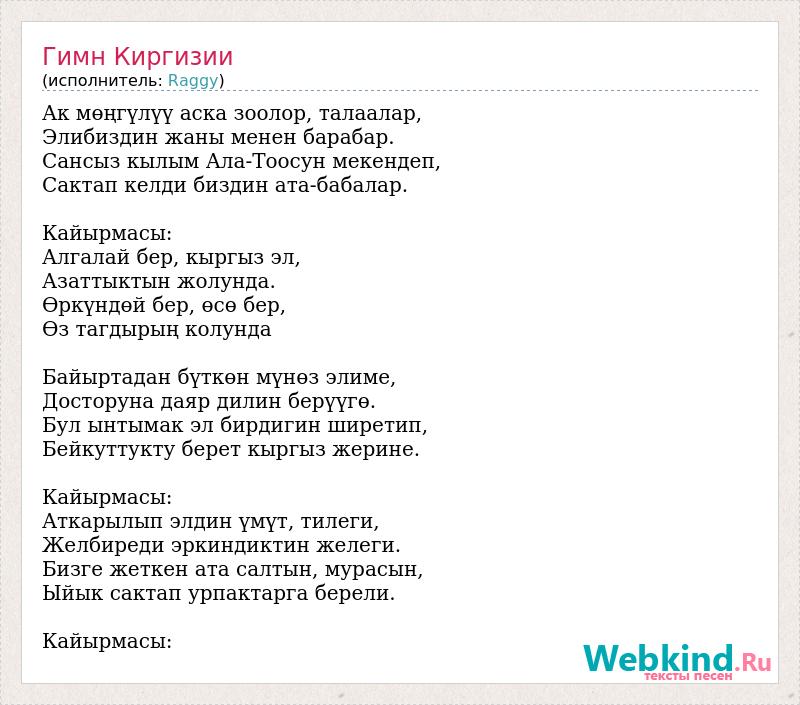 Ак мөңгүлүү аска зоолор, талаалар, Элибиздин жаны менен барабар. Сансыз кылым Ала-Тоосун мекендеп, Сактап келди биздин ата-бабалар. Кайырмасы: Алгалай бер, кыргыз эл, Азаттыктын жолунда. Өркүндөй бер, өсө бер, Өз тагдырың колунда Байыртадан бүткөн мүнөз элиме, Досторуна даяр дилин берүүгө. Бул ынтымак эл бирдигин ширетип, Бейкуттукту берет кыргыз жерине. Кайырмасы: Аткарылып элдин үмүт, тилеги, Желбиреди эркиндиктин желеги. Бизге жеткен ата салтын, мурасын, Ыйык сактап урпактарга берели. Кайырмасы: