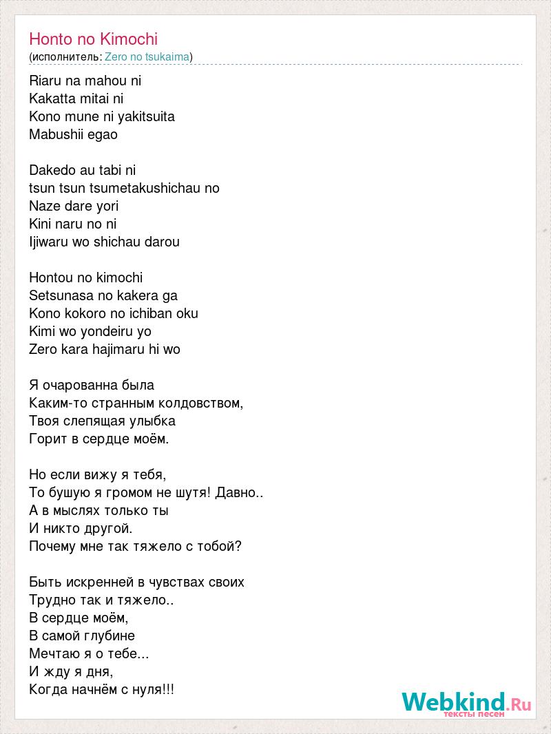 Riaru na mahou ni Kakatta mitai ni Kono mune ni yakitsuita Mabushii egao Dakedo au tabi ni tsun tsun tsumetakushichau no Naze dare yori Kini naru no ni Ijiwaru wo shichau darou Hontou no kimochi Setsunasa no kakera ga Kono kokoro no ichiban oku Kimi wo yondeiru yo Zero kara hajimaru hi wo Я очарованна была Каким-то странным колдовством, Твоя слепящая улыбка Горит в сердце моём. Но если вижу я тебя, То бушую я громом не шутя! Давно.. А в мыслях только ты И никто другой. Почему мне так тяжело с тобой? Быть искренней в чувствах своих Трудно так и тяжело.. В сердце моём, В самой глубине Мечтаю я о тебе... И жду я дня, Когда начнём с нуля!!!