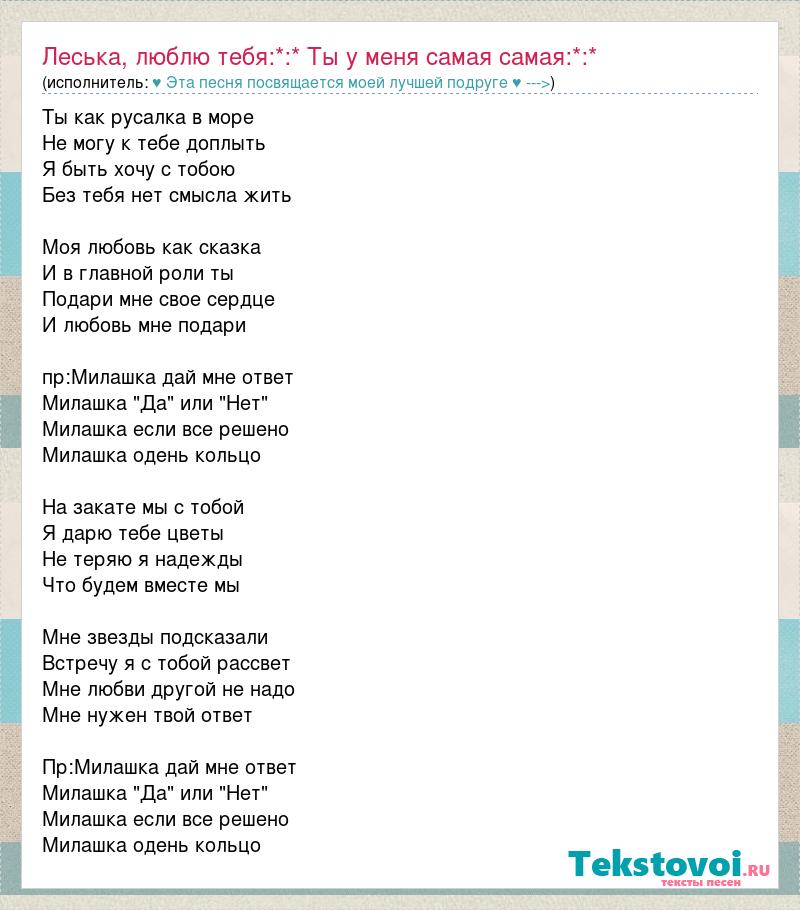 Ты как русалка в море Не могу к тебе доплыть Я быть хочу с тобою Без тебя нет смысла жить Моя любовь как сказка И в главной роли ты Подари мне свое сердце И любовь мне подари пр:Милашка дай мне ответ Милашка "Да" или "Нет" Милашка если все решено Милашка одень кольцо На закате мы с тобой Я дарю тебе цветы Не теряю я надежды Что будем вместе мы Мне звезды подсказали Встречу я с тобой рассвет Мне любви другой не надо Мне нужен твой ответ Пр:Милашка дай мне ответ Милашка "Да" или "Нет" Милашка если все решено Милашка одень кольцо