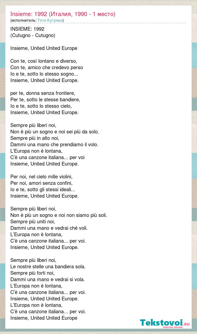 INSIEME: 1992 (Cutugno - Cutugno) Insieme, United United Europe Con te, così lontano e diverso, Con te, amico che credevo perso Io e te, sotto lo stesso sogno... Insieme, United United Europe. per te, donna senza frontiere, Per te, sotto le stesse bandiere, Io e te, sotto lo stesso cielo, Insieme, United United Europe. Sempre più liberi noi, Non è più un sogno e noi sei più da solo. Sempre più in alto noi, Dammi una mano che prendiamo il volo. L’Europa non è lontana, C’è una canzone italiana... per voi Insieme, United United Europe. Per noi, nel cielo mille violini, Per noi, amori senza confini, Io e te, sotto gli stessi ideali... Insieme, United United Europe. Sempre più liberi noi, Non è più un sogno e noi non siamo più soli. Sempre più uniti noi, Dammi una mano e vedrai ché voli. L’Europa non è lontana, C’è una canzone italiana... per voi. Insieme, United United Europe. Sempre più liberi noi, Le nostre stelle una bandiera sola. Sempre più forti noi, Dammi una mano e vedrai si vola. L’Europa non è lontana, C’è una canzone italiana... per voi. Insieme, United United Europe. L’Europa non è lontana, C’è una canzone italiana... per voi. Insieme, United United Europe