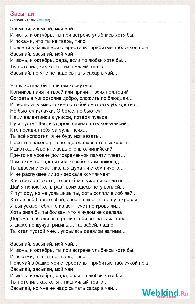 Засыпай, засыпай, мой май... И июнь, и октябрь, ты при встрече улыбнись хотя бы. И покажи, что ты не тварь, типо, Поломай в башке мои стереотипы, прибитые табличкой rip'a Засыпай, засыпай, мой май И июнь, и октябрь, рада, если по любви хотя бы... Ты потопил, как котят, наш милый театр... Засыпай, но мне не надо сыпать сахар в чай... Я так хотела бы пальцем коснуться Кончиков памяти твоей или причин твоих поллюций Согреть в микроволне добро, сложить по блюдцам... И перестать вместо кино с тобой смотреть ублюдство... Не бьются кулачки. О боже, не бьются! Наши валентинки в унисон, потеря пульса Ну и пусть! Шесть ударов, семнадцать конвульсий... Кто посадил тебя за руль, псих... Ты всё испортил, я не буду иск вязать... Прости я наконец-то не сдержалась это высказать. Идиотка... А во мне ведь огонь олимпийский Где-то на уровне долговременной памяти тлеет... Чем с кем-то поделиться, я себе съем пищевод... Ты вдвоем и счастлив, а я дура ни с кем ничего... И не распухшее лицо - зеркала комплимент, Хочется заплакать, но вот блин, уже ни капли нет... Дай я поною! хоть раз твоих здесь нету воплей... Я тут ору, но не услышишь ты, хоть солпли в лоб лей... Хоть в зоб бревно вбей, ласо на шее, спрыгну с кровли, Я выпускаю тебя,н о из вен течет не кровь ли... Хоть знал бы ты болван, что я чудом не сделала Дерьма глобального, решив тебя выгнать из тела... Я даже не шучу,п рикинь.... та, забей, ладно. Ты стал пустой мне... укрылась одеялом ватным... Засыпай, засыпай, мой май... И июнь, и октябрь, ты при встрече улыбнись хотя бы. И покажи, что ты не тварь, типо, Поломай в башке мои стереотипы, прибитые табличкой rip'a Засыпай, засыпай, мой май И июнь, и октябрь, рада, если по любви хотя бы... Ты потопил, как котят, наш милый театр... Засыпай, но мне не надо сыпать сахар в чай...