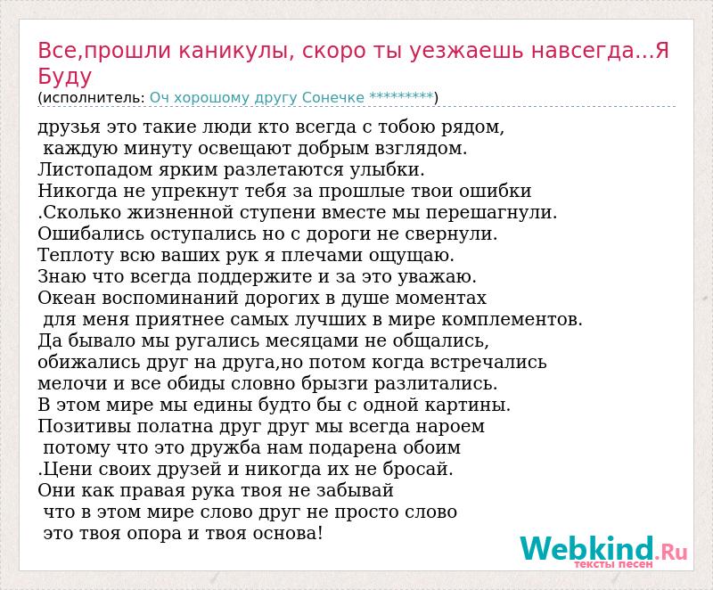 Главная→Исполнители→Оч хорошому другу Сонечке *********→Все,прошли каникулы, скоро ты уезжаешь навсегда...Я Буду