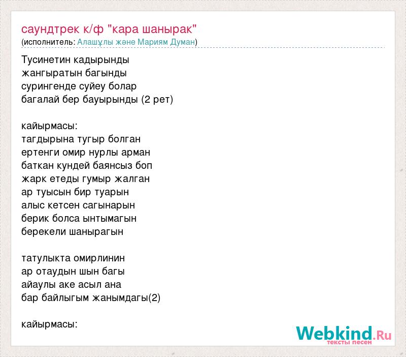 Тусинетин кадырынды жангыратын багынды сурингенде суйеу болар багалай бер бауырынды (2 рет) кайырмасы: тагдырына тугыр болган ертенги омир нурлы арман баткан кундей баянсыз боп жарк етеды гумыр жалган ар туысын бир туарын алыс кетсен сагынарын берик болса ынтымагын берекели шанырагын татулыкта омирлинин ар отаудын шын багы айаулы аке асыл ана бар байлыгым жанымдагы(2) кайырмасы:
