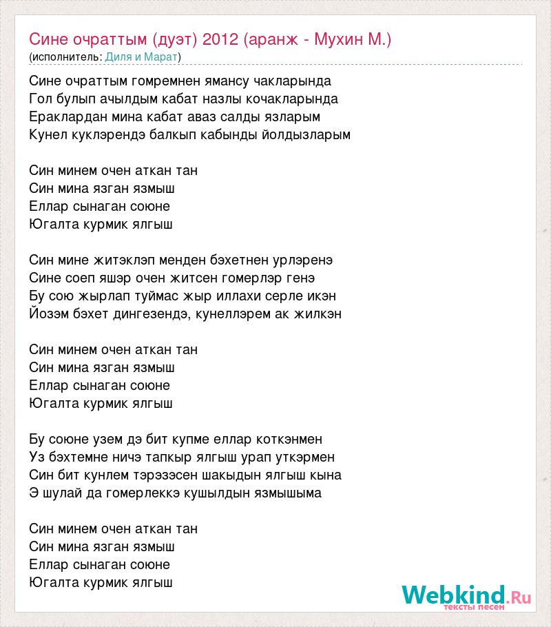 Сине очраттым гомремнен ямансу чакларында Гол булып ачылдым кабат назлы кочакларында Ераклардан мина кабат аваз салды язларым Кунел куклэрендэ балкып кабынды йолдызларым Син минем очен аткан тан Син мина язган язмыш Еллар сынаган союне Югалта курмик ялгыш Син мине житэклэп менден бэхетнен урлэренэ Сине соеп яшэр очен житсен гомерлэр генэ Бу сою жырлап туймас жыр иллахи серле икэн Йозэм бэхет дингезендэ, кунеллэрем ак жилкэн Син минем очен аткан тан Син мина язган язмыш Еллар сынаган союне Югалта курмик ялгыш Бу союне узем дэ бит купме еллар коткэнмен Уз бэхтемне ничэ тапкыр ялгыш урап уткэрмен Син бит кунлем тэрэзэсен шакыдын ялгыш кына Э шулай да гомерлеккэ кушылдын язмышыма Син минем очен аткан тан Син мина язган язмыш Еллар сынаган союне Югалта курмик ялгыш