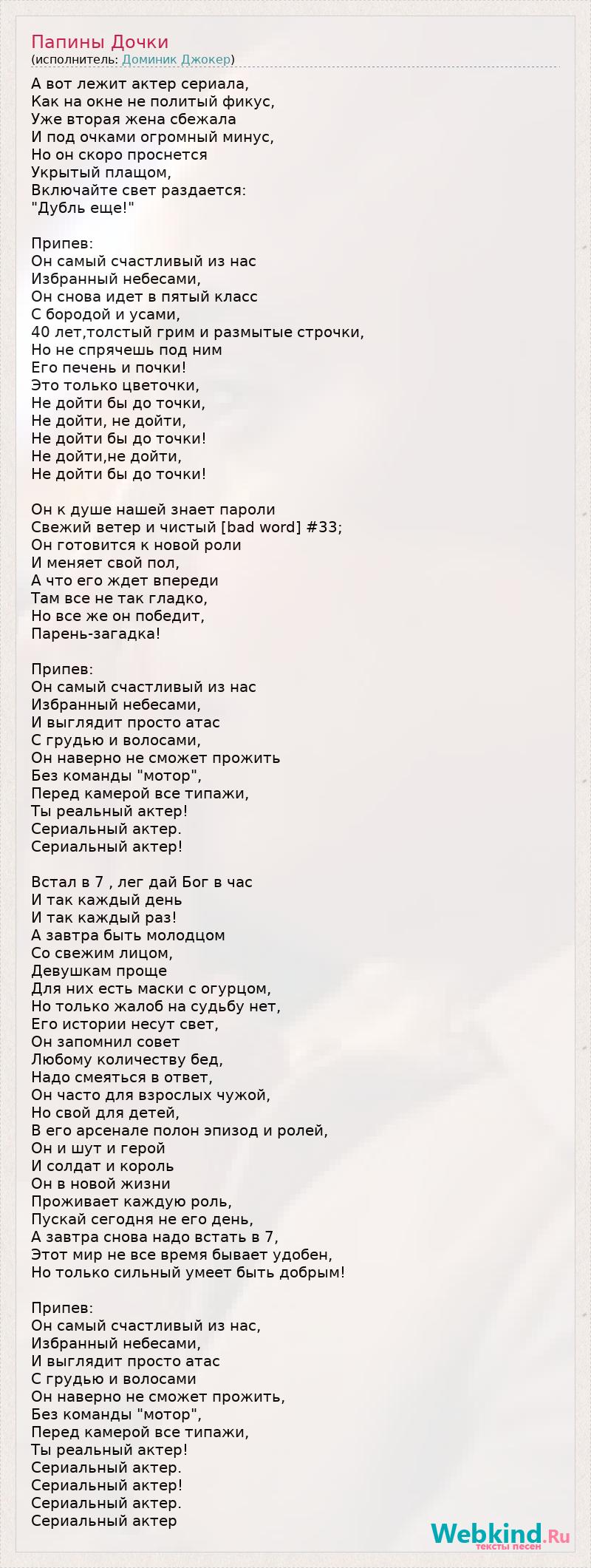 А вот лежит актер сериала, Как на окне не политый фикус, Уже вторая жена сбежала И под очками огромный минус, Но он скоро проснется Укрытый плащом, Включайте свет раздается: "Дубль еще!" Припев: Он самый счастливый из нас Избранный небесами, Он снова идет в пятый класс С бородой и усами, 40 лет,толстый грим и размытые строчки, Но не спрячешь под ним Его печень и почки! Это только цветочки, Не дойти бы до точки, Не дойти, не дойти, Не дойти бы до точки! Не дойти,не дойти, Не дойти бы до точки! Он к душе нашей знает пароли Свежий ветер и чистый [bad word] #33; Он готовится к новой роли И меняет свой пол, А что его ждет впереди Там все не так гладко, Но все же он победит, Парень-загадка! Припев: Он самый счастливый из нас Избранный небесами, И выглядит просто атас С грудью и волосами, Он наверно не сможет прожить Без команды "мотор", Перед камерой все типажи, Ты реальный актер! Сериальный актер. Сериальный актер! Встал в 7 , лег дай Бог в час И так каждый день И так каждый раз! А завтра быть молодцом Со свежим лицом, Девушкам проще Для них есть маски с огурцом, Но только жалоб на судьбу нет, Его истории несут свет, Он запомнил совет Любому количеству бед, Надо смеяться в ответ, Он часто для взрослых чужой, Но свой для детей, В его арсенале полон эпизод и ролей, Он и шут и герой И солдат и король Он в новой жизни Проживает каждую роль, Пускай сегодня не его день, А завтра снова надо встать в 7, Этот мир не все время бывает удобен, Но только сильный умеет быть добрым! Припев: Он самый счастливый из нас, Избранный небесами, И выглядит просто атас С грудью и волосами Он наверно не сможет прожить, Без команды "мотор", Перед камерой все типажи, Ты реальный актер! Сериальный актер. Сериальный актер! Сериальный актер. Сериальный актер