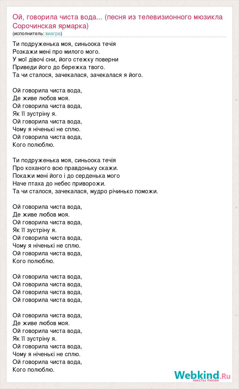 Ти подруженька моя, синьоока течія Розкажи мені про милого мого. У мої дівочі сни, його стежку поверни Приведи його до бережка твого. Та чи сталося, зачекалася, зачекалася я його. Ой говорила чиста вода, Де живе любов моя. Ой говорила чиста вода, Як її зустріну я. Ой говорила чиста вода, Чому я ніченькі не сплю. Ой говорила чиста вода, Кого полюблю. Ти подруженька моя, синьоока течія Про коханого всю правдоньку скажи. Покажи мені його і до серденька мого Наче птаха до небес приворожи. Та чи сталося, зачекалася, мудро річинько поможи. Ой говорила чиста вода, Де живе любов моя. Ой говорила чиста вода, Як її зустріну я. Ой говорила чиста вода, Чому я ніченькі не сплю. Ой говорила чиста вода, Кого полюблю. Ой говорила чиста вода, Ой говорила чиста вода, Ой говорила чиста вода, Ой говорила чиста вода, Ой говорила чиста вода, Де живе любов моя. Ой говорила чиста вода, Як її зустріну я. Ой говорила чиста вода, Чому я ніченькі не сплю. Ой говорила чиста вода, Кого полюблю.