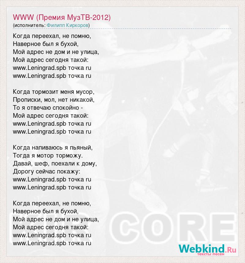 Когда переехал, не помню, Наверное был я бухой, Мой адрес не дом и не улица, Мой адрес сегодня такой: www.Leningrad.spb точка ru www.Leningrad.spb точка ru Когда тормозит меня мусор, Прописки, мол, нет никакой, То я отвечаю спокойно - Мой адрес сегодня такой: www.Leningrad.spb точка ru www.Leningrad.spb точка ru Когда напиваюсь я пьяный, Тогда я мотор торможу. Давай, шеф, поехали к дому, Дорогу сейчас покажу: www.Leningrad.spb точка ru www.Leningrad.spb точка ru Когда переехал, не помню, Наверное был я бухой, Мой адрес не дом и не улица, Мой адрес сегодня такой: www.Leningrad.spb точка ru www.Leningrad.spb точка ru