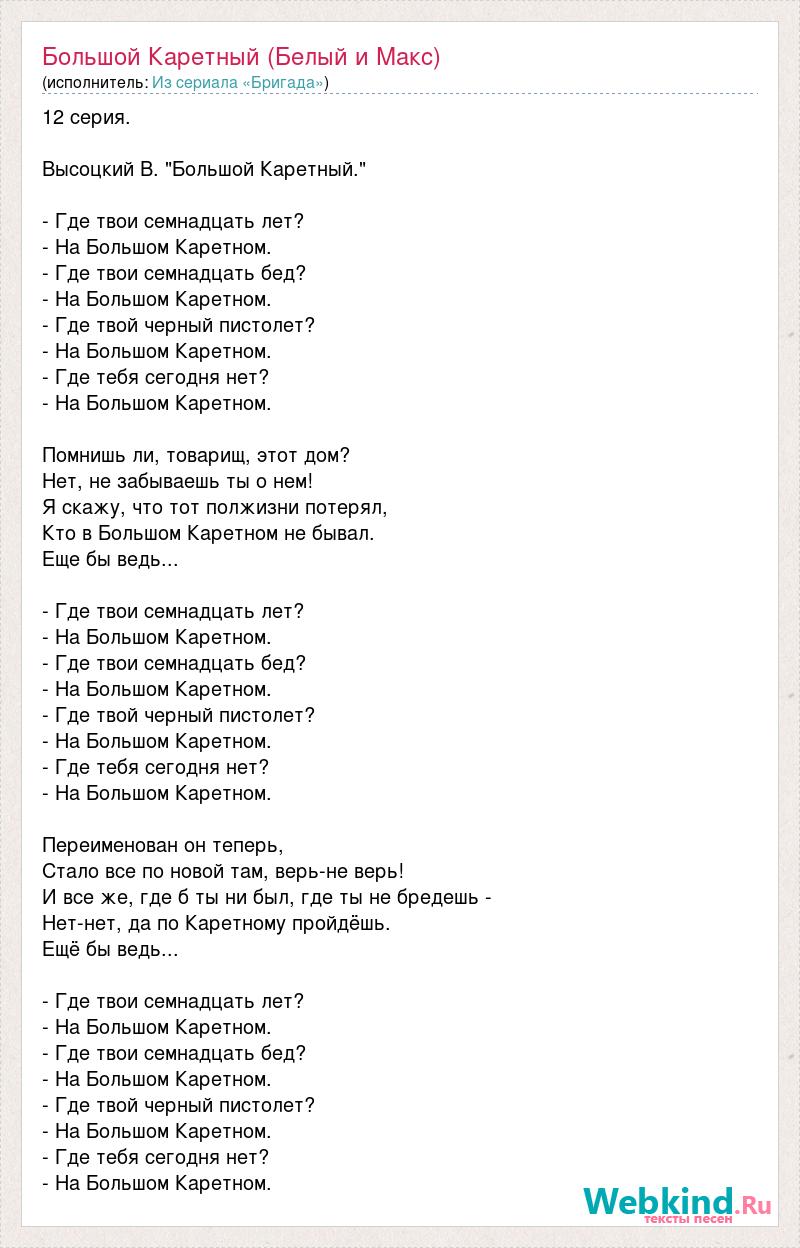 12 серия. Высоцкий В. "Большой Каретный." - Где твои семнадцать лет? - На Большом Каретном. - Где твои семнадцать бед? - На Большом Каретном. - Где твой черный пистолет? - На Большом Каретном. - Где тебя сегодня нет? - На Большом Каретном. Помнишь ли, товарищ, этот дом? Нет, не забываешь ты о нем! Я скажу, что тот полжизни потерял, Кто в Большом Каретном не бывал. Еще бы ведь... - Где твои семнадцать лет? - На Большом Каретном. - Где твои семнадцать бед? - На Большом Каретном. - Где твой черный пистолет? - На Большом Каретном. - Где тебя сегодня нет? - На Большом Каретном. Переименован он теперь, Стало все по новой там, верь-не верь! И все же, где б ты ни был, где ты не бредешь - Нет-нет, да по Каретному пройдёшь. Ещё бы ведь... - Где твои семнадцать лет? - На Большом Каретном. - Где твои семнадцать бед? - На Большом Каретном. - Где твой черный пистолет? - На Большом Каретном. - Где тебя сегодня нет? - На Большом Каретном.