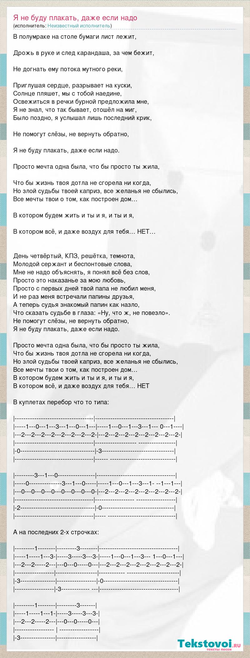 В полумраке на столе бумаги лист лежит, Дрожь в руке и след карандаша, за чем бежит, Не догнать ему потока мутного реки, Приглушая сердце, разрывает на куски, Солнце пляшет, мы с тобой наедине, Освежиться в речки бурной предложила мне, Я не знал, что так бывает, отошёл на миг, Было поздно, я услышал лишь последний крик, Не помогут слёзы, не вернуть обратно, Я не буду плакать, даже если надо. Просто мечта одна была, что бы просто ты жила, Что бы жизнь твоя дотла не сгорела ни когда, Но злой судьбы твоей каприз, все желанья не сбылись, Все мечты твои о том, как построен дом… В котором будем жить и ты и я, и ты и я, В котором всё, и даже воздух для тебя… НЕТ… День четвёртый, КПЗ, решётка, темнота, Молодой сержант и беспонтовые слова, Мне не надо объяснять, я понял всё без слов, Просто это наказанье за мою любовь, Просто с первых дней твой папа не любил меня, И не раз меня встречали папины друзья, А теперь судья знакомый папин как назло, Что сказать судьбе в глаза: «Ну, что ж, не повезло». Не помогут слёзы, не вернуть обратно, Я не буду плакать, даже если надо. Просто мечта одна была, что бы просто ты жила, Что бы жизнь твоя дотла не сгорела ни когда, Но злой судьбы твоей каприз, все желанья не сбылись, Все мечты твои о том, как построен дом… В котором будем жить и ты и я, и ты и я, В котором всё, и даже воздух для тебя… НЕТ В куплетах перебор что то типа: |------------------------------------|------------------------------------| |-----1---0---1---3---1---0---1---|-----1---0---1---3---1--- 0---1----| |---2---2---2---2---2---2---2---2-|---2---2---2---2---2---2---2---2-| |------------------------------------|------------------- -----------------| |-0----------------------------------|-3---------------------------------| |------------------------------------|------ ------------------------------| |---------3---1---0-----------------|------------------------------------| |-----0---------------3---1---0-----|-----1---0---1---3---1- --1---1---| |---0---0---0---0---0---0---0---0-|---2---2---2---2---2---2---2---2-| |------------------------------------|------------------ ------------------| |-2----------------------------------|-0---------------------------------| |------------------------------------|----- -------------------------------| А на последних 2-х строчках: |---------1--------|---------3--------|------------------------------------| |-----1-----1---3-|-----3-----3---3-|-----1---0---1---3--- 1---0---1---| |---2---2-----2---|---0---0-----0---|---2---2---2---2---2---2---2---2-| |------------------|-------------------|------------ ------------------------| |-3----------------|------------------|-0----------------------------------| |------------------|-3------------- ---|------------------------------------| |---------1--------|---------3-------| |-----1-----1---1-|-----3-----3---3-| |---2---2-----2---|---0---0-----0---| |------------------ | ------------------| |-3----------------|------------------|