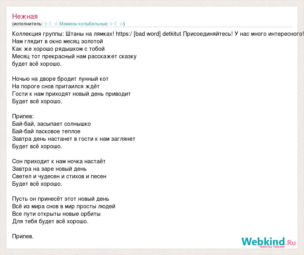 Коллекция группы: Штаны на лямках! https:/ [bad word] detkitut Присоединяйтесь! У нас много интересного! Нам глядит в окно месяц золотой Как же хорошо рядышком с тобой Месяц тот прекрасный нам расскажет сказку будет всё хорошо. Ночью на дворе бродит лунный кот На пороге снов притаился ждёт Гости к нам приходят новый день приводит Будет всё хорошо. Припев: Бай-бай, засыпает солнышко Бай-бай ласковое теплое Завтра день настанет в гости к нам заглянет Будет всё хорошо. Сон приходит к нам ночка настаёт Завтра на заре новый день Светел и чудесен и стихов и песен Будет всё хорошо. Пусть он принесёт этот новый день Всё из мира снов в мир просты людей Все пути открыты новые орбиты Для тебя будет всё хорошо. Припев.