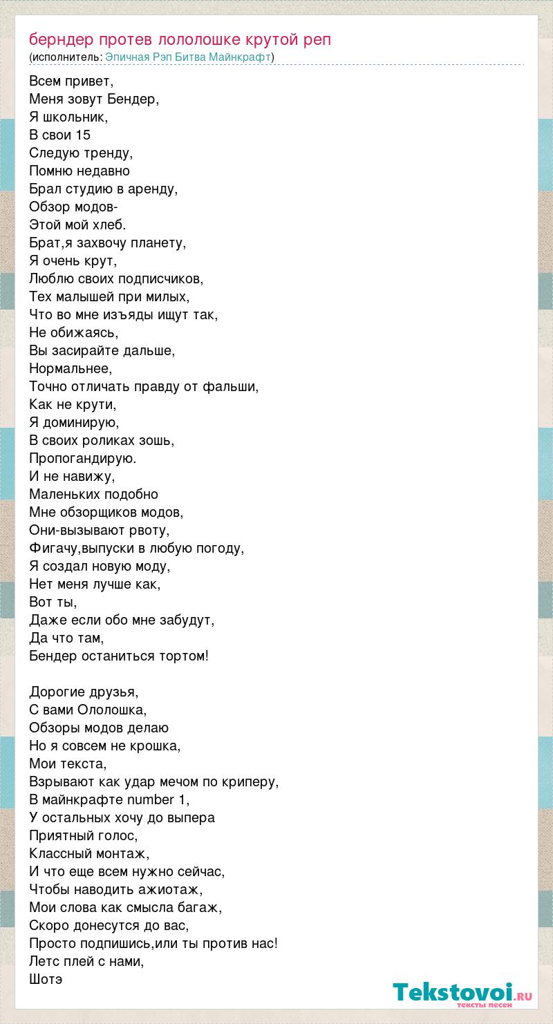 Всем привет, Меня зовут Бендер, Я школьник, В свои 15 Следую тренду, Помню недавно Брал студию в аренду, Обзор модов- Этой мой хлеб. Брат,я захвочу планету, Я очень крут, Люблю своих подписчиков, Тех малышей при милых, Что во мне изъяды ищут так, Не обижаясь, Вы засирайте дальше, Нормальнее, Точно отличать правду от фальши, Как не крути, Я доминирую, В своих роликах зошь, Пропогандирую. И не навижу, Маленьких подобно Мне обзорщиков модов, Они-вызывают рвоту, Фигачу,выпуски в любую погоду, Я создал новую моду, Нет меня лучше как, Вот ты, Даже если обо мне забудут, Да что там, Бендер останиться тортом! Дорогие друзья, С вами Ололошка, Обзоры модов делаю Но я совсем не крошка, Мои текста, Взрывают как удар мечом по криперу, В майнкрафте number 1, У остальных хочу до выпера Приятный голос, Классный монтаж, И что еще всем нужно сейчас, Чтобы наводить ажиотаж, Мои слова как смысла багаж, Скоро донесутся до вас, Просто подпишись,или ты против нас! Летс плей с нами, Шотэ