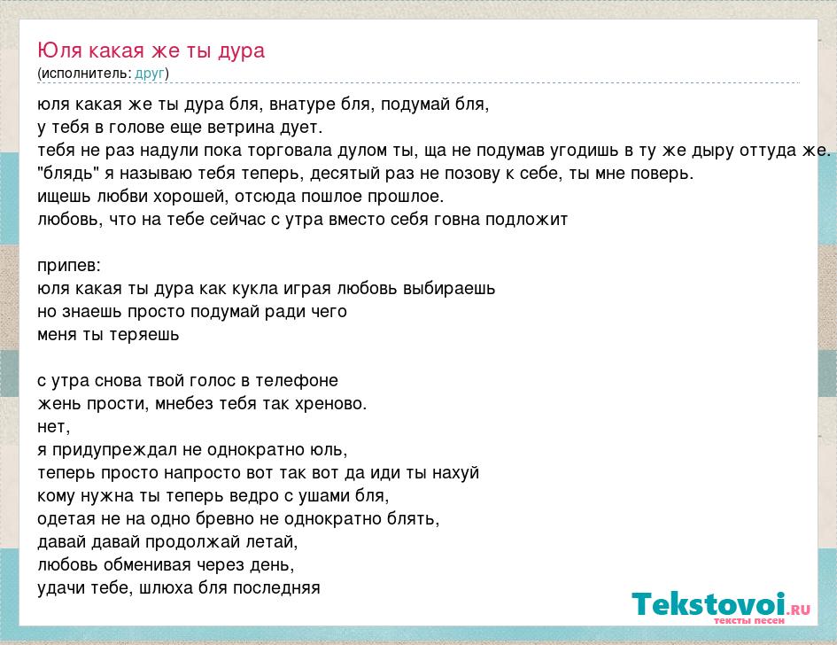 юля какая же ты дура бля, внатуре бля, подумай бля, у тебя в голове еще ветрина дует. тебя не раз надули пока торговала дулом ты, ща не подумав угодишь в ту же дыру оттуда же. "блядь" я называю тебя теперь, десятый раз не позову к себе, ты мне поверь. ищешь любви хорошей, отсюда пошлое прошлое. любовь, что на тебе сейчас с утра вместо себя говна подложит припев: юля какая ты дура как кукла играя любовь выбираешь но знаешь просто подумай ради чего меня ты теряешь с утра снова твой голос в телефоне жень прости, мнебез тебя так хреново. нет, я придупреждал не однократно юль, теперь просто напросто вот так вот да иди ты нахуй кому нужна ты теперь ведро с ушами бля, одетая не на одно бревно не однократно блять, давай давай продолжай летай, любовь обменивая через день, удачи тебе, шлюха бля последняя