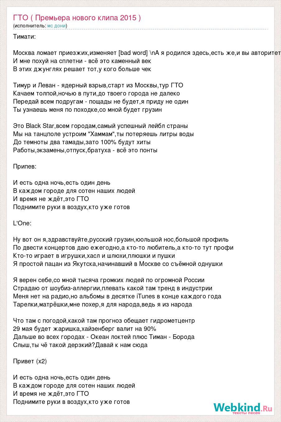 Тимати: Москва ломает приезжих,изменяет [bad word] \nА я родился здесь,есть же,и вы авторитет И мне похуй на сплетни - всё это каменный век В этих джунглях решает тот,у кого больше чек Тимур и Леван - ядерный взрыв,старт из Москвы,тур ГТО Качаем толпой,ночью в пути,до твоего города не далеко Передай всем подругам - пощады не будет,я приду не один Ты узнаешь меня по походке,со мной будет грузин Это Black Star,всем городам,самый успешный лейбл страны Мы на танцполе устроим "Хаммам",ты потеряешь литры воды До темноты два тамады,зато 100% будут хиты Работы,экзамены,отпуск,братуха - всё это понты Припев: И есть одна ночь,есть один день В каждом городе для сотен наших людей И время не ждёт,это ГТО Поднимите руки в воздух,кто уже готов L'One: Ну вот он я,здравствуйте,русский грузин,юольшой нос,большой профиль По двести концертов даю ежегодно,а кто-то любитель,а кто-то тут профи Кто-то играет в игрушки,хасл и шлюхи,плюшки и пушки Я простой пацан из Якутска,начинавший в Москве со съёмной однушки Я верен себе,со мной тысяча громких людей по огромной России Страдаю от шоубиз-аллергии,плевать какой там тренд в индустрии Меня нет на радио,но альбомы в десятке iTunes в конце каждого года Тарелки,матрёшки,мне похер,я для народа,ведь я из народа Что там с погодой,какой там прогноз обещает гидрометцентр 29 мая будет жаришка,хайзенберг валит на 90% Дальше во всех городах - Океан локтей плюс Тиман - Борода Слыш,ты чё такой дерзкий?Давай к нам сюда Привет (х2) И есть одна ночь,есть один день В каждом городе для сотен наших людей И время не ждёт,это ГТО Поднимите руки в воздух,кто уже готов