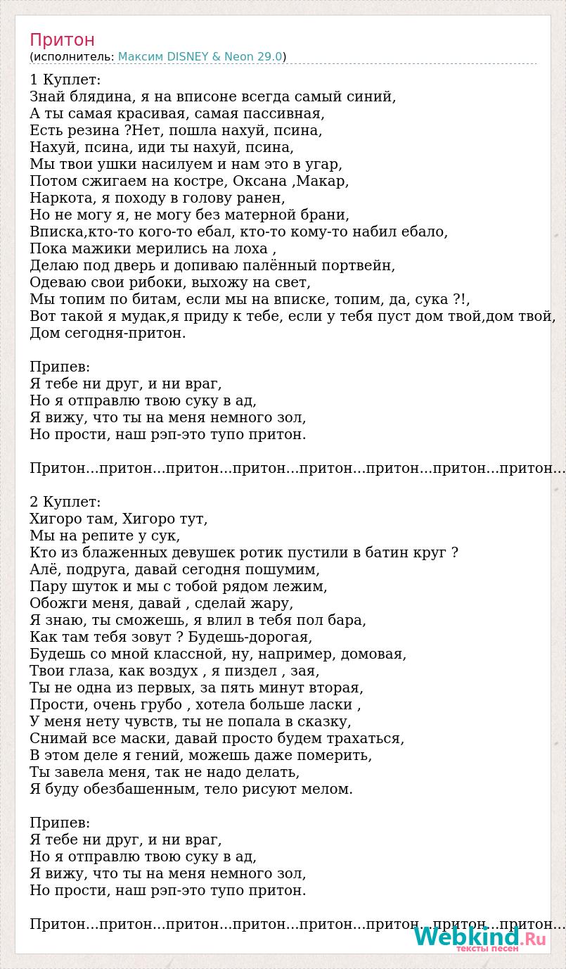 1 Куплет: Знай блядина, я на вписоне всегда самый синий, А ты самая красивая, самая пассивная, Есть резина ?Нет, пошла нахуй, псина, Нахуй, псина, иди ты нахуй, псина, Мы твои ушки насилуем и нам это в угар, Потом сжигаем на костре, Оксана ,Макар, Наркота, я походу в голову ранен, Но не могу я, не могу без матерной брани, Вписка,кто-то кого-то ебал, кто-то кому-то набил ебало, Пока мажики мерились на лоха , Делаю под дверь и допиваю палённый портвейн, Одеваю свои рибоки, выхожу на свет, Мы топим по битам, если мы на вписке, топим, да, сука ?!, Вот такой я мудак,я приду к тебе, если у тебя пуст дом твой,дом твой, Дом сегодня-притон. Припев: Я тебе ни друг, и ни враг, Но я отправлю твою суку в ад, Я вижу, что ты на меня немного зол, Но прости, наш рэп-это тупо притон. Притон...притон...притон...притон...притон...притон...притон...притон... 2 Куплет: Хигоро там, Хигоро тут, Мы на репите у сук, Кто из блаженных девушек ротик пустили в батин круг ? Алё, подруга, давай сегодня пошумим, Пару шуток и мы с тобой рядом лежим, Обожги меня, давай , сделай жару, Я знаю, ты сможешь, я влил в тебя пол бара, Как там тебя зовут ? Будешь-дорогая, Будешь со мной классной, ну, например, домовая, Твои глаза, как воздух , я пиздел , зая, Ты не одна из первых, за пять минут вторая, Прости, очень грубо , хотела больше ласки , У меня нету чувств, ты не попала в сказку, Снимай все маски, давай просто будем трахаться, В этом деле я гений, можешь даже померить, Ты завела меня, так не надо делать, Я буду обезбашенным, тело рисуют мелом. Припев: Я тебе ни друг, и ни враг, Но я отправлю твою суку в ад, Я вижу, что ты на меня немного зол, Но прости, наш рэп-это тупо притон. Притон...притон...притон...притон...притон...притон...притон...притон...