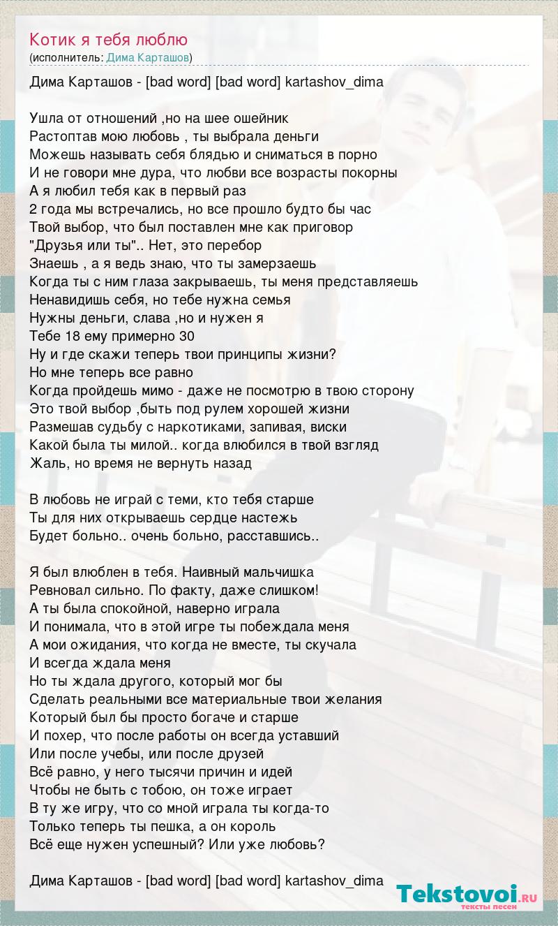 Дима Карташов - [bad word] [bad word] kartashov_dima Ушла от отношений ,но на шее ошейник Растоптав мою любовь , ты выбрала деньги Можешь называть себя блядью и сниматься в порно И не говори мне дура, что любви все возрасты покорны А я любил тебя как в первый раз 2 года мы встречались, но все прошло будто бы час Твой выбор, что был поставлен мне как приговор "Друзья или ты".. Нет, это перебор Знаешь , а я ведь знаю, что ты замерзаешь Когда ты с ним глаза закрываешь, ты меня представляешь Ненавидишь себя, но тебе нужна семья Нужны деньги, слава ,но и нужен я Тебе 18 ему примерно 30 Ну и где скажи теперь твои принципы жизни? Но мне теперь все равно Когда пройдешь мимо - даже не посмотрю в твою сторону Это твой выбор ,быть под рулем хорошей жизни Размешав судьбу с наркотиками, запивая, виски Какой была ты милой.. когда влюбился в твой взгляд Жаль, но время не вернуть назад В любовь не играй с теми, кто тебя старше Ты для них открываешь сердце настежь Будет больно.. очень больно, расставшись.. Я был влюблен в тебя. Наивный мальчишка Ревновал сильно. По факту, даже слишком! А ты была спокойной, наверно играла И понимала, что в этой игре ты побеждала меня А мои ожидания, что когда не вместе, ты скучала И всегда ждала меня Но ты ждала другого, который мог бы Сделать реальными все материальные твои желания Который был бы просто богаче и старше И похер, что после работы он всегда уставший Или после учебы, или после друзей Всё равно, у него тысячи причин и идей Чтобы не быть с тобою, он тоже играет В ту же игру, что со мной играла ты когда-то Только теперь ты пешка, а он король Всё еще нужен успешный? Или уже любовь? Дима Карташов - [bad word] [bad word] kartashov_dima