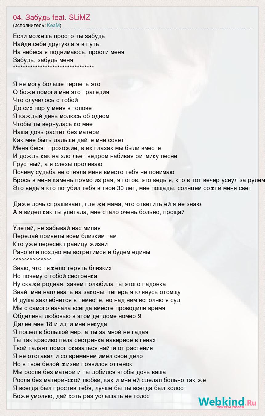 Если можешь просто ты забудь Найди себе другую а я в путь На небеса я поднимаюсь, прости меня Забудь, забудь меня ********************************* Я не могу больше терпеть это О боже помоги мне это трагедия Что случилось с тобой До сих пор у меня в голове Я каждый день молюсь об одном Чтобы ты вернулась ко мне Наша дочь растет без матери Как мне быть дальше дайте мне совет Меня бесят прохожие, в их глазах мы были вместе И дождь как на зло льет ведром набивая ритмику песне Грустный, а я слезы проливаю Почему судьба не отняла меня вместо тебя не понимаю Брось в меня камень прямо из рая, я готов, это ведь я, кто в тот вечер уснул за рулем Это ведь я кто погубил тебя в твои 30 лет, мне пощады, солнцем сожги меня свет Даже дочь спрашивает, где же мама, что ответить ей я не знаю А я видел как ты улетала, мне стало очень больно, прощай ____________ Улетай, не забывай нас милая Передай приветы всем близким там Кто уже пересек границу жизни Рано или поздно мы встретимся и будем едины ^^^^^^^^^^^^^^ Знаю, что тяжело терять близких Но почему с тобой сестренка Ну скажи родная, зачем полюбила ты этого падонка Знай, мне наплевать на законы, теперь я клянусь отомщу И душа захлебнется в темноте, но над ним исполню я суд Мы с самого начала всегда вместе проводили время Обделены любовью в этом детдоме номер 9 Далее мне 18 и идти мне некуда Я пошел в большой мир, а ты за мной не гадая Ты так красиво пела сестренка наверное в генах Твой талант помог оказаться найти от растения Я не отставал и со временем имел свое дело Но в твое белой жизни появился оттенок Мы росли без матери и ты добился чтобы дочь ваша Росла без материнской любви, как и мне ей сделал больно так же Я всегда был простив тебя, лучше бы ты всегда был холост Боже умоляю, дай хоть раз услышать ее голос