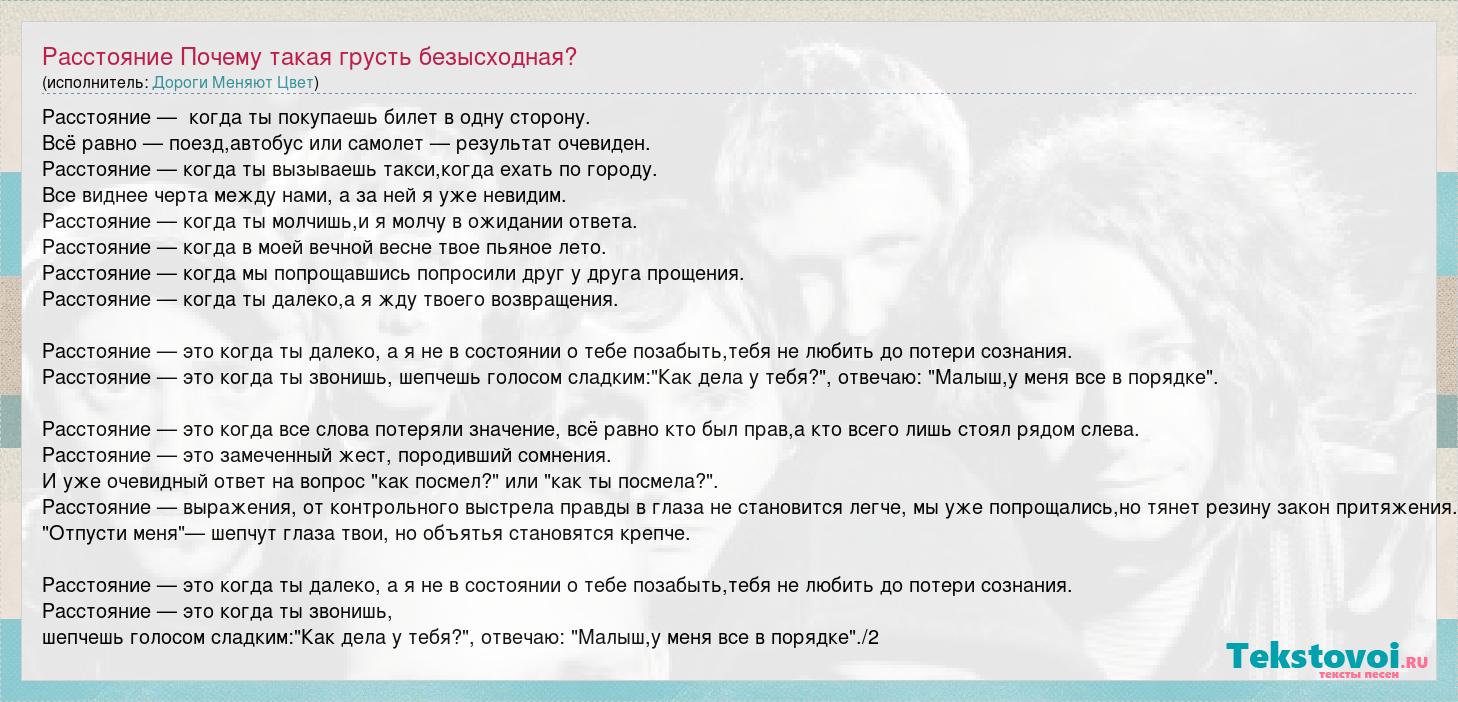 А как ты думаешь, о чем песня "Расстояние Почему такая грусть безысходная?" ?