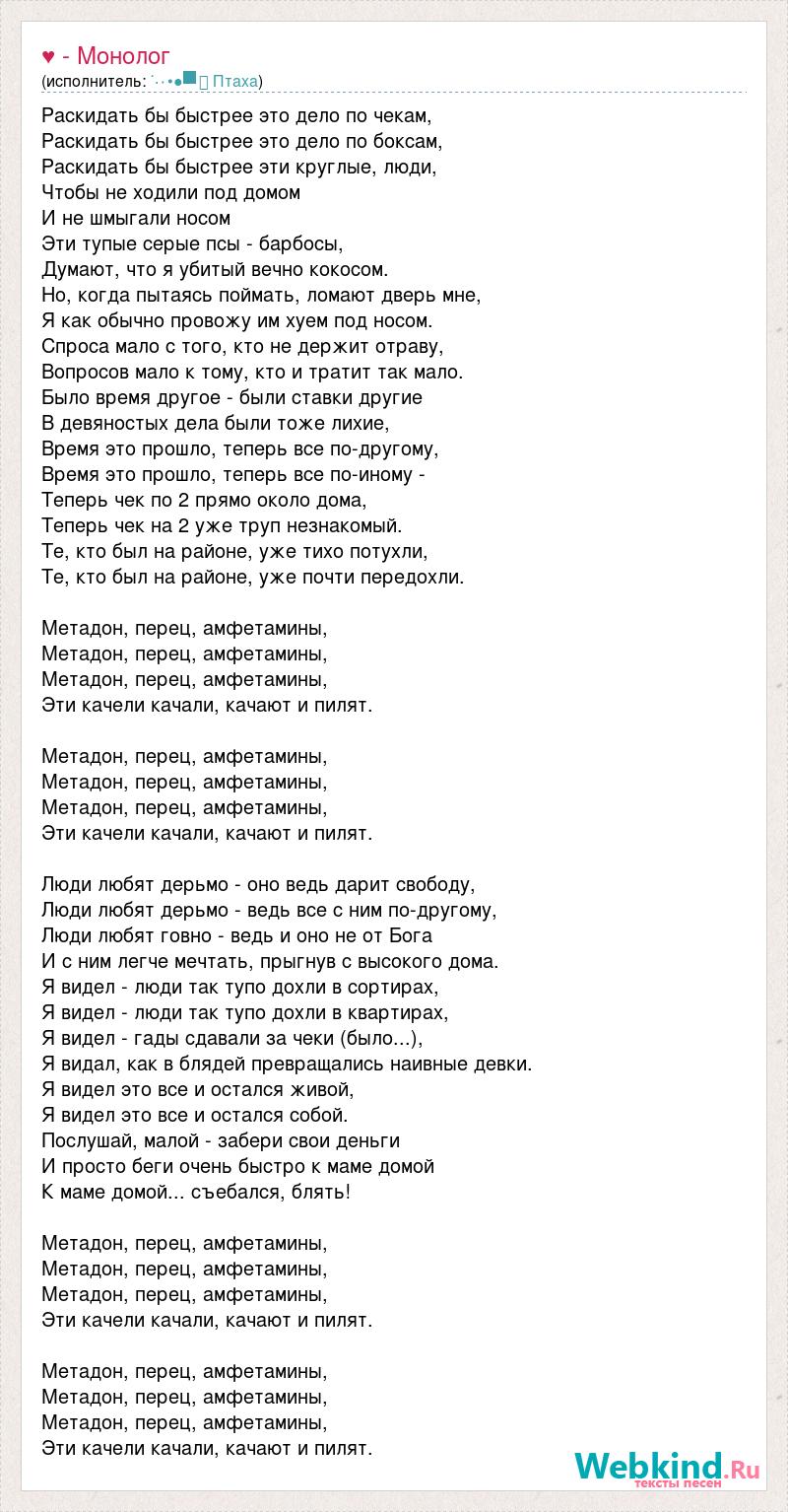 Раскидать бы быстрее это дело по чекам, Раскидать бы быстрее это дело по боксам, Раскидать бы быстрее эти круглые, люди, Чтобы не ходили под домом И не шмыгали носом Эти тупые серые псы - барбосы, Думают, что я убитый вечно кокосом. Но, когда пытаясь поймать, ломают дверь мне, Я как обычно провожу им хуем под носом. Спроса мало с того, кто не держит отраву, Вопросов мало к тому, кто и тратит так мало. Было время другое - были ставки другие В девяностых дела были тоже лихие, Время это прошло, теперь все по-другому, Время это прошло, теперь все по-иному - Теперь чек по 2 прямо около дома, Теперь чек на 2 уже труп незнакомый. Те, кто был на районе, уже тихо потухли, Те, кто был на районе, уже почти передохли. Метадон, перец, амфетамины, Метадон, перец, амфетамины, Метадон, перец, амфетамины, Эти качели качали, качают и пилят. Метадон, перец, амфетамины, Метадон, перец, амфетамины, Метадон, перец, амфетамины, Эти качели качали, качают и пилят. Люди любят дерьмо - оно ведь дарит свободу, Люди любят дерьмо - ведь все с ним по-другому, Люди любят говно - ведь и оно не от Бога И с ним легче мечтать, прыгнув с высокого дома. Я видел - люди так тупо дохли в сортирах, Я видел - люди так тупо дохли в квартирах, Я видел - гады сдавали за чеки (было...), Я видал, как в блядей превращались наивные девки. Я видел это все и остался живой, Я видел это все и остался собой. Послушай, малой - забери свои деньги И просто беги очень быстро к маме домой К маме домой... съебался, блять! Метадон, перец, амфетамины, Метадон, перец, амфетамины, Метадон, перец, амфетамины, Эти качели качали, качают и пилят. Метадон, перец, амфетамины, Метадон, перец, амфетамины, Метадон, перец, амфетамины, Эти качели качали, качают и пилят.