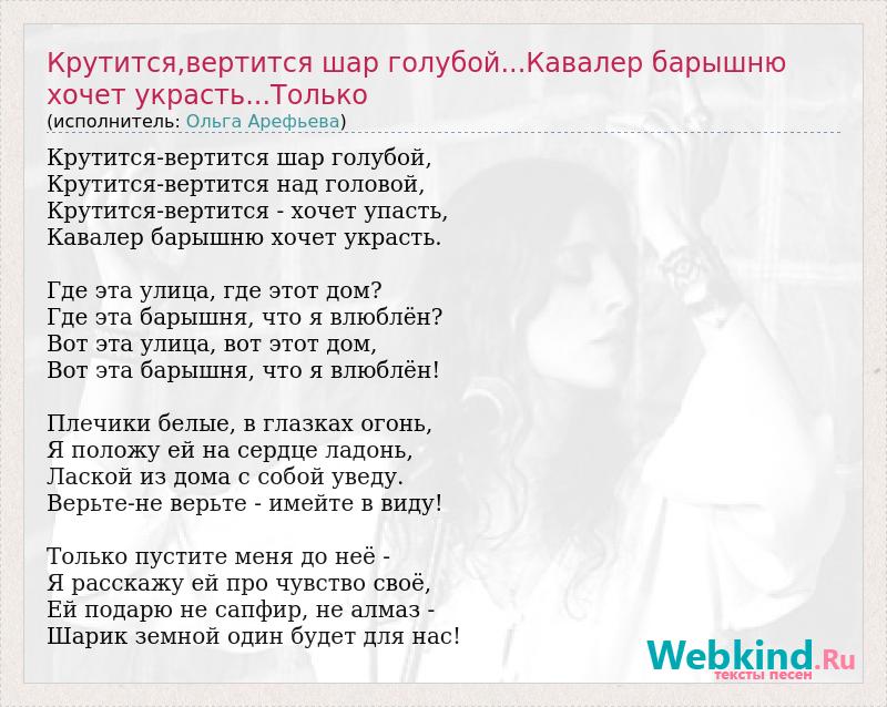 Крутится-вертится шар голубой, Крутится-вертится над головой, Крутится-вертится - хочет упасть, Кавалер барышню хочет украсть. Где эта улица, где этот дом? Где эта барышня, что я влюблён? Вот эта улица, вот этот дом, Вот эта барышня, что я влюблён! Плечики белые, в глазках огонь, Я положу ей на сердце ладонь, Лаской из дома с собой уведу. Верьте-не верьте - имейте в виду! Только пустите меня до неё - Я расскажу ей про чувство своё, Ей подарю не сапфир, не алмаз - Шарик земной один будет для нас!