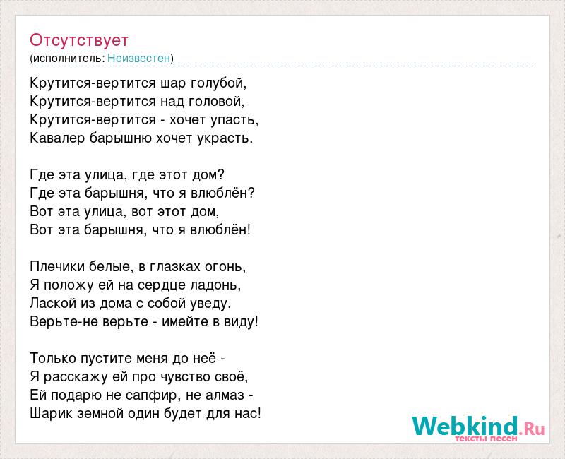 Крутится-вертится шар голубой, Крутится-вертится над головой, Крутится-вертится - хочет упасть, Кавалер барышню хочет украсть. Где эта улица, где этот дом? Где эта барышня, что я влюблён? Вот эта улица, вот этот дом, Вот эта барышня, что я влюблён! Плечики белые, в глазках огонь, Я положу ей на сердце ладонь, Лаской из дома с собой уведу. Верьте-не верьте - имейте в виду! Только пустите меня до неё - Я расскажу ей про чувство своё, Ей подарю не сапфир, не алмаз - Шарик земной один будет для нас!