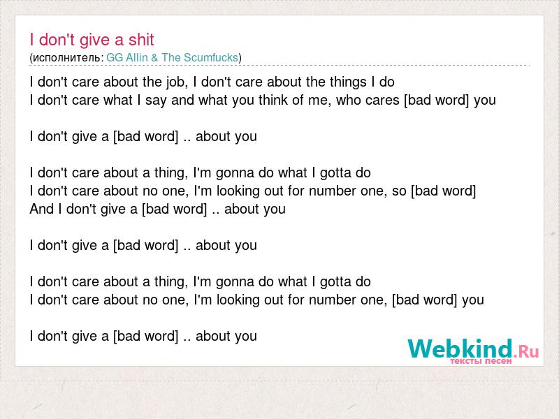 I don't care about the job, I don't care about the things I do I don't care what I say and what you think of me, who cares [bad word] you I don't give a [bad word] .. about you I don't care about a thing, I'm gonna do what I gotta do I don't care about no one, I'm looking out for number one, so [bad word] And I don't give a [bad word] .. about you I don't give a [bad word] .. about you I don't care about a thing, I'm gonna do what I gotta do I don't care about no one, I'm looking out for number one, [bad word] you I don't give a [bad word] .. about you