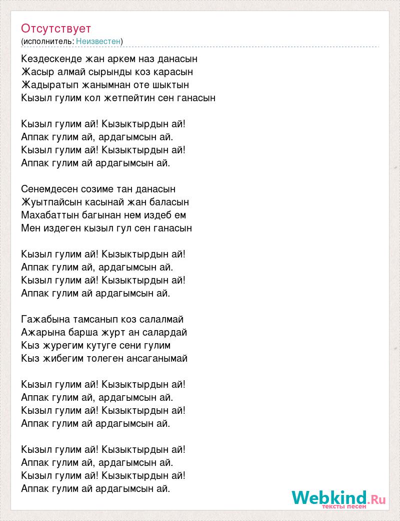 Кездескенде жан аркем наз данасын Жасыр алмай сырынды коз карасын Жадыратып жанымнан оте шыктын Кызыл гулим кол жетпейтин сен ганасын Кызыл гулим ай! Кызыктырдын ай! Аппак гулим ай, ардагымсын ай. Кызыл гулим ай! Кызыктырдын ай! Аппак гулим ай ардагымсын ай. Сенемдесен созиме тан данасын Жуытпайсын касынай жан баласын Махабаттын багынан нем издеб ем Мен издеген кызыл гул сен ганасын Кызыл гулим ай! Кызыктырдын ай! Аппак гулим ай, ардагымсын ай. Кызыл гулим ай! Кызыктырдын ай! Аппак гулим ай ардагымсын ай. Гажабына тамсанып коз салалмай Ажарына барша журт ан салардай Кыз журегим кутуге сени гулим Кыз жибегим толеген ансаганымай Кызыл гулим ай! Кызыктырдын ай! Аппак гулим ай, ардагымсын ай. Кызыл гулим ай! Кызыктырдын ай! Аппак гулим ай ардагымсын ай. Кызыл гулим ай! Кызыктырдын ай! Аппак гулим ай, ардагымсын ай. Кызыл гулим ай! Кызыктырдын ай! Аппак гулим ай ардагымсын ай.