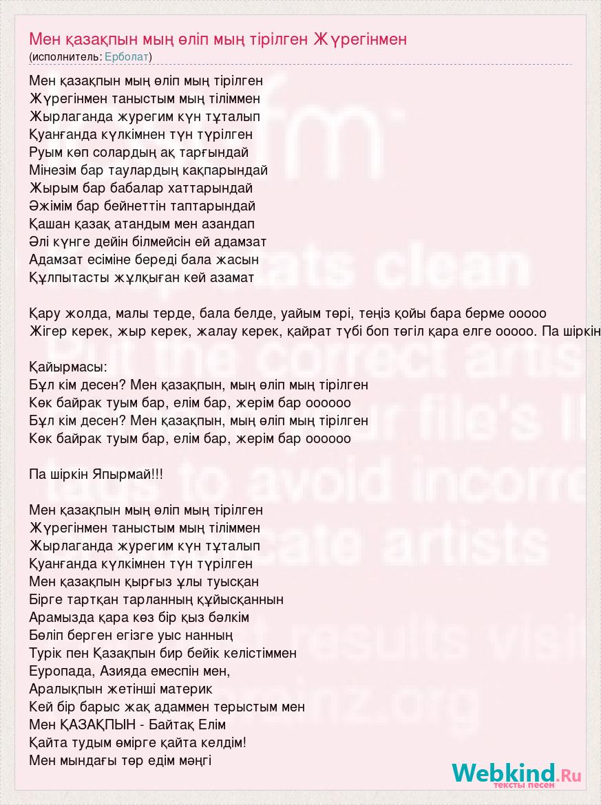 Мен қазақпын мың өліп мың тірілген Жүрегінмен таныстым мың тіліммен Жырлаганда журегим күн тұталып Қуанғанда күлкімнен түн түрілген Руым көп солардың ақ тарғындай Мінезім бар таулардың кақпарындай Жырым бар бабалар хаттарындай Әжімім бар бейнеттін таптарындай Қашан қазақ атандым мен азандап Әлі күнге дейін білмейсін ей адамзат Адамзат есіміне береді бала жасын Құлпытасты жұлқыған кей азамат Қару жолда, малы терде, бала белде, уайым төрі, теңіз қойы бара берме ооооо Жігер керек, жыр керек, жалау керек, қайрат түбі боп төгіл қара елге ооооо. Па шіркін Қайырмасы: Бұл кім десен? Мен қазақпын, мың өліп мың тірілген Көк байрак туым бар, елім бар, жерім бар оооооо Бұл кім десен? Мен қазақпын, мың өліп мың тірілген Көк байрак туым бар, елім бар, жерім бар оооооо Па шіркін Япырмай!!! Мен қазақпын мың өліп мың тірілген Жүрегінмен таныстым мың тіліммен Жырлаганда журегим күн тұталып Қуанғанда күлкімнен түн түрілген Мен қазақпын қырғыз ұлы туысқан Бірге тартқан тарланның құйысқаннын Арамызда қара көз бір қыз бәлкім Бөліп берген егізге уыс нанның Турік пен Қазақпын бир бейік келістіммен Еуропада, Азияда емеспін мен, Аралықпын жетінші материк Кей бір барыс жақ адаммен терыстым мен Мен ҚАЗАҚПЫН - Байтақ Елім Қайта тудым өмірге қайта келдім! Мен мындағы төр едім мәңгі