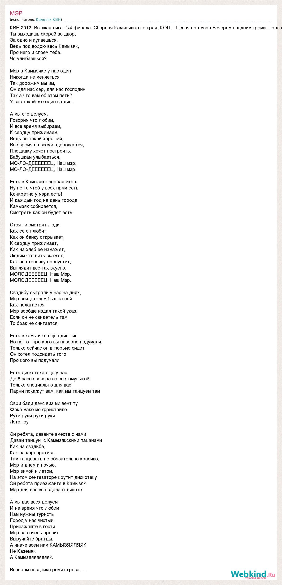 КВН 2012. Высшая лига. 1/4 финала. Сборная Камызякского края. КОП. - Песня про мэра Вечером поздним гремит гроза Ты выходишь скорей во двор, За одно и купаешься. Ведь под водою весь Камызяк, Про него и споем тебе. Чо улыбаешься? Мэр в Камызяке у нас один Никогда не меняеться Так дорожим мы им, Он для нас сэр, для нас господин Так а что вам об этом петь? У вас такой же один в один. А мы его целуем, Говорим что любим, И все время выбираем, К сердцу прижимаем, Ведь он такой хороший, Всё время со всеми здоровается, Площадку хочет построить, Бабушкам улыбаеться, МО-ЛО-ДЕЕЕЕЕЕЦ, Наш мэр, МО-ЛО-ДЕЕЕЕЕЕЦ, Наш мэр. Есть в Камызяке черная икра, Ну не то чтоб у всех прям есть Конкретно у мэра есть! И каждый год на день города Камызяк собирается, Смотреть как он будет есть. Стоят и смотрят люди Как ее он любит, Как он банку открывает, К сердцу прижимает, Как на хлеб ее намажет, Людям что нить скажет, Как он стопочку пропустит, Выглядит все так вкусно, МОЛОДЕЕЕЕЕЦ. Наш Мэр. МОЛОДЕЕЕЕЕЦ. Наш Мэр. Свадьбу сыграли у нас на днях, Мэр свидетелем был на ней Как полагается. Мэр вообще издал такой указ, Если он не свидетель там То брак не считается. Есть в камызяке еще один тип Но не тот про кого вы наверно подумали, Только сейчас он в тюрьме сидит Он хотел подсидеть того Про кого вы подумали Есть дискотека еще у нас. До 8 часов вечера со светомузыкой Только специально для вас Парни покажут вам, как мы танцуем там Эври бади дэнс виз ми вент ту Фака мако мо фристайло Руки руки руки руки Лэтс гоу Эй ребята, давайте вместе с нами Давай танцуй с Камызякскими пацанами Как на свадьбе, Как на корпоративе, Там танцевать не обязательно красиво, Мэр и днем и ночью, Мэр зимой и летом, На этом сентезаторе крутит дискотеку Эй ребята приезжайте в Камызяк Мэр для вас всё сделает ништяк А мы вас всех целуем И не время что любим Нам нужны туристы Город у нас чистый Приезжайте в гости Мэр вас очень просит Выручайте братцы, А иначе всем нам КАМЫЗЯЯЯЯЯК Не Каземяк А Камызяяяяяяяяк. Вечером поздним гремит гроза.....