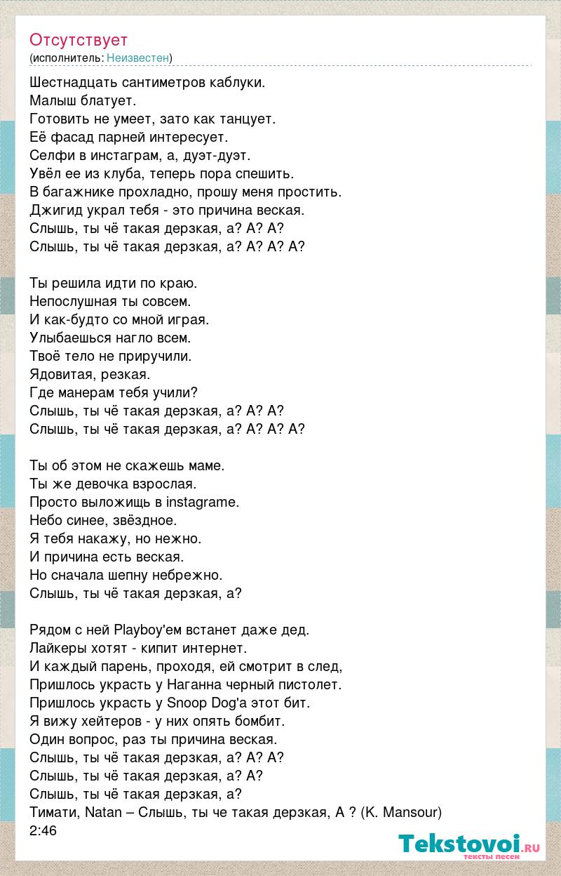 Шестнадцать сантиметров каблуки. Малыш блатует. Готовить не умеет, зато как танцует. Её фасад парней интересует. Селфи в инстаграм, а, дуэт-дуэт. Увёл ее из клуба, теперь пора спешить. В багажнике прохладно, прошу меня простить. Джигид украл тебя - это причина веская. Слышь, ты чё такая дерзкая, а? А? А? Слышь, ты чё такая дерзкая, а? А? А? А? Ты решила идти по краю. Непослушная ты совсем. И как-будто со мной играя. Улыбаешься нагло всем. Твоё тело не приручили. Ядовитая, резкая. Где манерам тебя учили? Слышь, ты чё такая дерзкая, а? А? А? Слышь, ты чё такая дерзкая, а? А? А? А? Ты об этом не скажешь маме. Ты же девочка взрослая. Просто выложищь в instagramе. Небо синее, звёздное. Я тебя накажу, но нежно. И причина есть веская. Но сначала шепну небрежно. Слышь, ты чё такая дерзкая, а? Рядом с ней Plаyboy'ем встанет даже дед. Лайкеры хотят - кипит интернет. И каждый парень, проходя, ей смотрит в след, Пришлось украсть у Наганна черный пистолет. Пришлось украсть у Snoop Dog'а этот бит. Я вижу хейтеров - у них опять бомбит. Один вопрос, раз ты причина веская. Слышь, ты чё такая дерзкая, а? А? А? Слышь, ты чё такая дерзкая, а? А? Слышь, ты чё такая дерзкая, а? Тимати, Natan – Слышь, ты че такая дерзкая, А ? (K. Mansour) 2:46