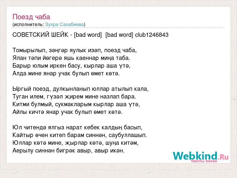 СОВЕТСКИЙ ШЕЙК - [bad word] [bad word] club1246843 Томырылып, зәңгәр яулык изәп, поезд чаба, Ялан тәпи йөгерә яшь каеннар миңа таба. Барыр юлым иркен басу, кырлар аша үтә, Алда мине янар учак булып өмет көтә. Ыргый поезд, дулкынланып юллар атылып кала, Туган илем, гүзәл җирем мине назлап бара. Китми булмый, сукмакларым кырлар аша үтә, Айлы кичтә янар учак булып өмет көтә. Юл читендә ялгыз нарат кебек калдың басып, Кайтыр өчен китеп барам синнән, саубуллашып. Юллар көтә мине, җырлар көтә, шуңа китәм, Аерылу синнән бигрәк авыр, авыр икән.