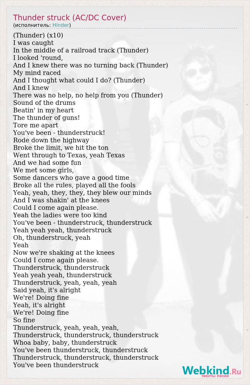 (Thunder) (x10) I was caught In the middle of a railroad track (Thunder) I looked 'round, And I knew there was no turning back (Thunder) My mind raced And I thought what could I do? (Thunder) And I knew There was no help, no help from you (Thunder) Sound of the drums Beatin' in my heart The thunder of guns! Tore me apart You've been - thunderstruck! Rode down the highway Broke the limit, we hit the ton Went through to Texas, yeah Texas And we had some fun We met some girls, Some dancers who gave a good time Broke all the rules, played all the fools Yeah, yeah, they, they, they blew our minds And I was shakin' at the knees Could I come again please. Yeah the ladies were too kind You've been - thunderstruck, thunderstruck Yeah yeah yeah, thunderstruck Oh, thunderstruck, yeah Yeah Now we're shaking at the knees Could I come again please. Thunderstruck, thunderstruck Yeah yeah yeah, thunderstruck Thunderstruck, yeah, yeah, yeah Said yeah, it's alright We're! Doing fine Yeah, it's alright We're! Doing fine So fine Thunderstruck, yeah, yeah, yeah, Thunderstruck, thunderstruck, thunderstruck Whoa baby, baby, thunderstruck You've been thunderstruck, thunderstruck Thunderstruck, thunderstruck, thunderstruck You've been thunderstruck