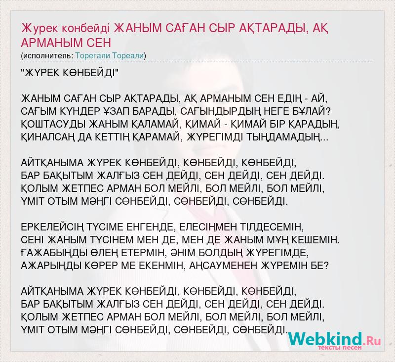"ЖҮРЕК КӨНБЕЙДІ" ЖАНЫМ САҒАН СЫР АҚТАРАДЫ, АҚ АРМАНЫМ СЕН ЕДІҢ - АЙ, САҒЫМ КҮНДЕР ҰЗАП БАРАДЫ, САҒЫНДЫРДЫҢ НЕГЕ БҰЛАЙ? ҚОШТАСУДЫ ЖАНЫМ ҚАЛАМАЙ, ҚИМАЙ - ҚИМАЙ БІР ҚАРАДЫҢ, ҚИНАЛСАҢ ДА КЕТТІҢ ҚАРАМАЙ, ЖҮРЕГІМДІ ТЫҢДАМАДЫҢ... АЙТҚАНЫМА ЖҮРЕК КӨНБЕЙДІ, КӨНБЕЙДІ, КӨНБЕЙДІ, БАР БАҚЫТЫМ ЖАЛҒЫЗ СЕН ДЕЙДІ, СЕН ДЕЙДІ, СЕН ДЕЙДІ. ҚОЛЫМ ЖЕТПЕС АРМАН БОЛ МЕЙЛІ, БОЛ МЕЙЛІ, БОЛ МЕЙЛІ, ҮМІТ ОТЫМ МӘҢГІ СӨНБЕЙДІ, СӨНБЕЙДІ, СӨНБЕЙДІ. ЕРКЕЛЕЙСІҢ ТҮСІМЕ ЕНГЕНДЕ, ЕЛЕСІҢМЕН ТІЛДЕСЕМІН, СЕНІ ЖАНЫМ ТҮСІНЕМ МЕН ДЕ, МЕН ДЕ ЖАНЫМ МҰҢ КЕШЕМІН. ҒАЖАБЫҢДЫ ӨЛЕҢ ЕТЕРМІН, ӘНІМ БОЛДЫҢ ЖҮРЕГІМДЕ, АЖАРЫҢДЫ КӨРЕР МЕ ЕКЕНМІН, АҢСАУМЕНЕН ЖҮРЕМІН БЕ? АЙТҚАНЫМА ЖҮРЕК КӨНБЕЙДІ, КӨНБЕЙДІ, КӨНБЕЙДІ, БАР БАҚЫТЫМ ЖАЛҒЫЗ СЕН ДЕЙДІ, СЕН ДЕЙДІ, СЕН ДЕЙДІ. ҚОЛЫМ ЖЕТПЕС АРМАН БОЛ МЕЙЛІ, БОЛ МЕЙЛІ, БОЛ МЕЙЛІ, ҮМІТ ОТЫМ МӘҢГІ СӨНБЕЙДІ, СӨНБЕЙДІ, СӨНБЕЙДІ.