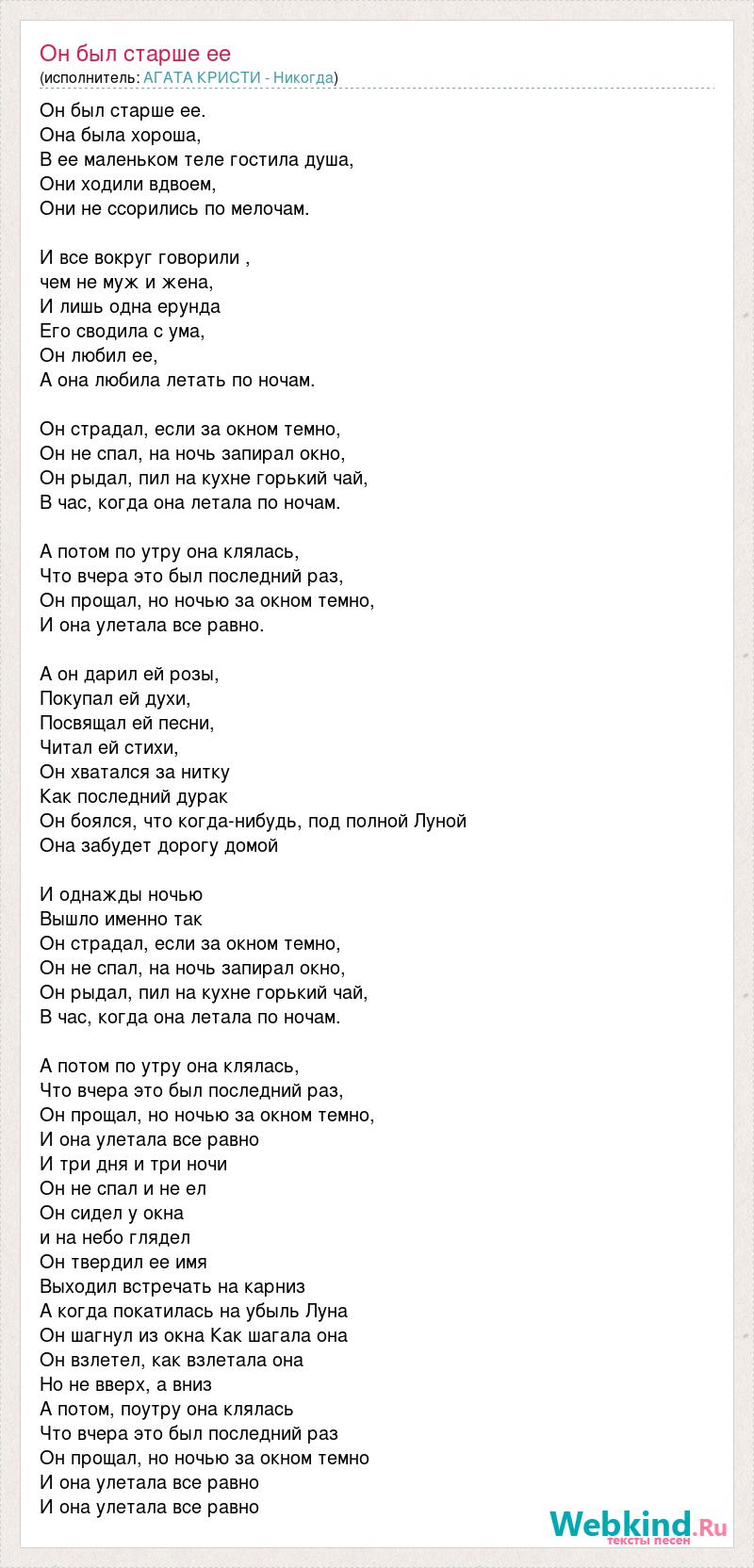 Он был старше ее. Она была хороша, В ее маленьком теле гостила душа, Они ходили вдвоем, Они не ссорились по мелочам. И все вокруг говорили , чем не муж и жена, И лишь одна ерунда Его сводила с ума, Он любил ее, А она любила летать по ночам. Он страдал, если за окном темно, Он не спал, на ночь запирал окно, Он рыдал, пил на кухне горький чай, В час, когда она летала по ночам. А потом по утру она клялась, Что вчера это был последний раз, Он прощал, но ночью за окном темно, И она улетала все равно. А он дарил ей розы, Покупал ей духи, Посвящал ей песни, Читал ей стихи, Он хватался за нитку Как последний дурак Он боялся, что когда-нибудь, под полной Луной Она забудет дорогу домой И однажды ночью Вышло именно так Он страдал, если за окном темно, Он не спал, на ночь запирал окно, Он рыдал, пил на кухне горький чай, В час, когда она летала по ночам. А потом по утру она клялась, Что вчера это был последний раз, Он прощал, но ночью за окном темно, И она улетала все равно И три дня и три ночи Он не спал и не ел Он сидел у окна и на небо глядел Он твердил ее имя Выходил встречать на карниз А когда покатилась на убыль Луна Он шагнул из окна Как шагала она Он взлетел, как взлетала она Но не вверх, а вниз А потом, поутру она клялась Что вчера это был последний раз Он прощал, но ночью за окном темно И она улетала все равно И она улетала все равно