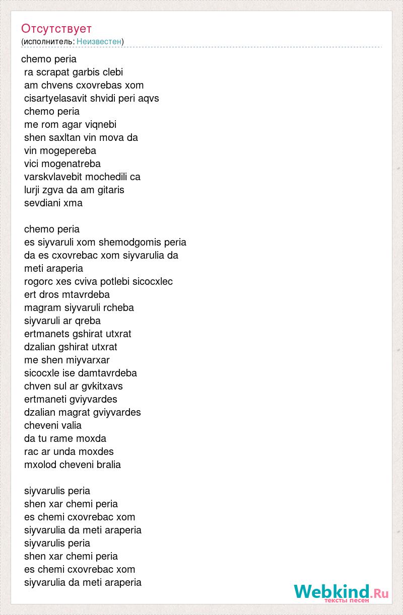 chemo peria ra scrapat garbis clebi am chvens cxovrebas xom cisartyelasavit shvidi peri aqvs chemo peria me rom agar viqnebi shen saxltan vin mova da vin mogepereba vici mogenatreba varskvlavebit mochedili ca lurji zgva da am gitaris sevdiani xma chemo peria es siyvaruli xom shemodgomis peria da es cxovrebac xom siyvarulia da meti araperia rogorc xes cviva potlebi sicocxlec ert dros mtavrdeba magram siyvaruli rcheba siyvaruli ar qreba ertmanets gshirat utxrat dzalian gshirat utxrat me shen miyvarxar sicocxle ise damtavrdeba chven sul ar gvkitxavs ertmaneti gviyvardes dzalian magrat gviyvardes cheveni valia da tu rame moxda rac ar unda moxdes mxolod cheveni bralia siyvarulis peria shen xar chemi peria es chemi cxovrebac xom siyvarulia da meti araperia siyvarulis peria shen xar chemi peria es chemi cxovrebac xom siyvarulia da meti araperia