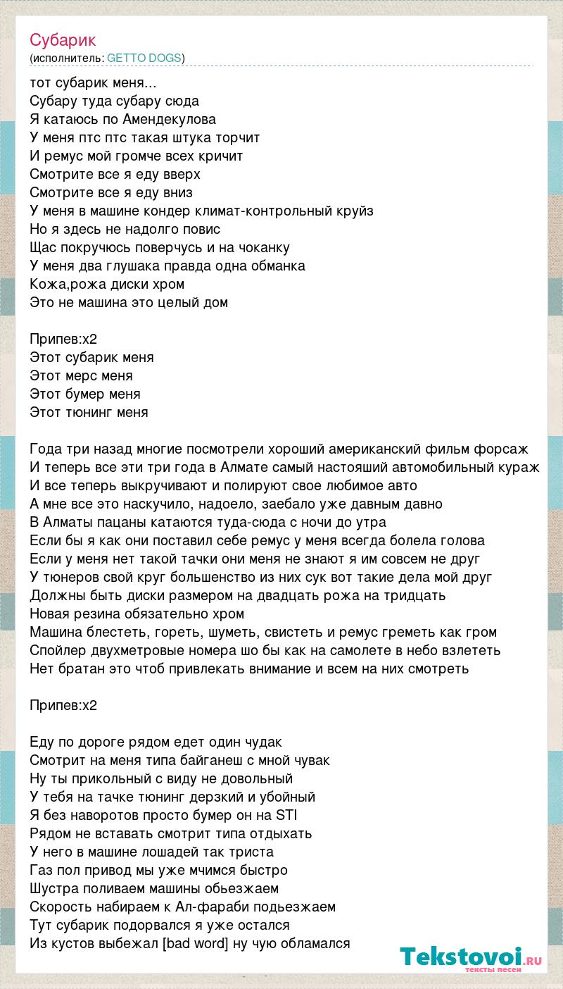 тот субарик меня... Субару туда субару сюда Я катаюсь по Амендекулова У меня птс птс такая штука торчит И ремус мой громче всех кричит Смотрите все я еду вверх Смотрите все я еду вниз У меня в машине кондер климат-контрольный круйз Но я здесь не надолго повис Щас покручюсь поверчусь и на чоканку У меня два глушака правда одна обманка Кожа,рожа диски хром Это не машина это целый дом Припев:х2 Этот субарик меня Этот мерс меня Этот бумер меня Этот тюнинг меня Года три назад многие посмотрели хороший американский фильм форсаж И теперь все эти три года в Алмате самый настояший автомобильный кураж И все теперь выкручивают и полируют свое любимое авто А мне все это наскучило, надоело, заебало уже давным давно В Алматы пацаны катаются туда-сюда с ночи до утра Если бы я как они поставил себе ремус у меня всегда болела голова Если у меня нет такой тачки они меня не знают я им совсем не друг У тюнеров свой круг большенство из них сук вот такие дела мой друг Должны быть диски размером на двадцать рожа на тридцать Новая резина обязательно хром Машина блестеть, гореть, шуметь, свистеть и ремус греметь как гром Спойлер двухметровые номера шо бы как на самолете в небо взлететь Нет братан это чтоб привлекать внимание и всем на них смотреть Припев:х2 Еду по дороге рядом едет один чудак Смотрит на меня типа байганеш с мной чувак Ну ты прикольный с виду не довольный У тебя на тачке тюнинг дерзкий и убойный Я без наворотов просто бумер он на STI Рядом не вставать смотрит типа отдыхать У него в машине лошадей так триста Газ пол привод мы уже мчимся быстро Шустра поливаем машины обьезжаем Скорость набираем к Ал-фараби подьезжаем Тут субарик подорвался я уже остался Из кустов выбежал [bad word] ну чую обламался