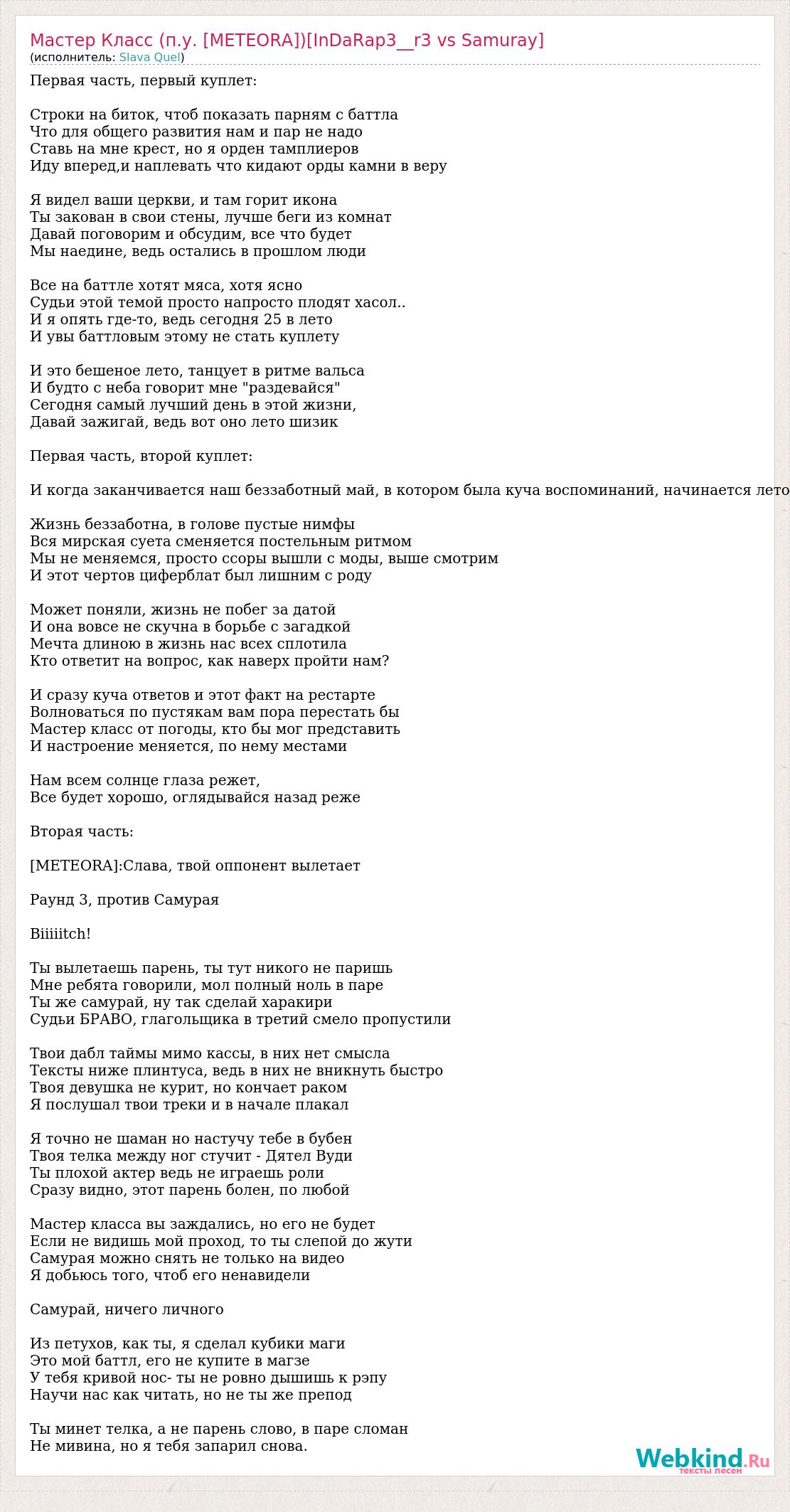Первая часть, первый куплет: Строки на биток, чтоб показать парням с баттла Что для общего развития нам и пар не надо Ставь на мне крест, но я орден тамплиеров Иду вперед,и наплевать что кидают орды камни в веру Я видел ваши церкви, и там горит икона Ты закован в свои стены, лучше беги из комнат Давай поговорим и обсудим, все что будет Мы наедине, ведь остались в прошлом люди Все на баттле хотят мяса, хотя ясно Судьи этой темой просто напросто плодят хасол.. И я опять где-то, ведь сегодня 25 в лето И увы баттловым этому не стать куплету И это бешеное лето, танцует в ритме вальса И будто с неба говорит мне "раздевайся" Сегодня самый лучший день в этой жизни, Давай зажигай, ведь вот оно лето шизик Первая часть, второй куплет: И когда заканчивается наш беззаботный май, в котором была куча воспоминаний, начинается лето Жизнь беззаботна, в голове пустые нимфы Вся мирская суета сменяется постельным ритмом Мы не меняемся, просто ссоры вышли с моды, выше смотрим И этот чертов циферблат был лишним с роду Может поняли, жизнь не побег за датой И она вовсе не скучна в борьбе с загадкой Мечта длиною в жизнь нас всех сплотила Кто ответит на вопрос, как наверх пройти нам? И сразу куча ответов и этот факт на рестарте Волноваться по пустякам вам пора перестать бы Мастер класс от погоды, кто бы мог представить И настроение меняется, по нему местами Нам всем солнце глаза режет, Все будет хорошо, оглядывайся назад реже Вторая часть: [METEORA]:Слава, твой оппонент вылетает Раунд 3, против Самурая Biiiiitch! Ты вылетаешь парень, ты тут никого не паришь Мне ребята говорили, мол полный ноль в паре Ты же самурай, ну так сделай харакири Судьи БРАВО, глагольщика в третий смело пропустили Твои дабл таймы мимо кассы, в них нет смысла Тексты ниже плинтуса, ведь в них не вникнуть быстро Твоя девушка не курит, но кончает раком Я послушал твои треки и в начале плакал Я точно не шаман но настучу тебе в бубен Твоя телка между ног стучит - Дятел Вуди Ты плохой актер ведь не играешь роли Сразу видно, этот парень болен, по любой Мастер класса вы заждались, но его не будет Если не видишь мой проход, то ты слепой до жути Самурая можно снять не только на видео Я добьюсь того, чтоб его ненавидели Самурай, ничего личного Из петухов, как ты, я сделал кубики маги Это мой баттл, его не купите в магзе У тебя кривой нос- ты не ровно дышишь к рэпу Научи нас как читать, но не ты же препод Ты минет телка, а не парень слово, в паре сломан Не мивина, но я тебя запарил снова.