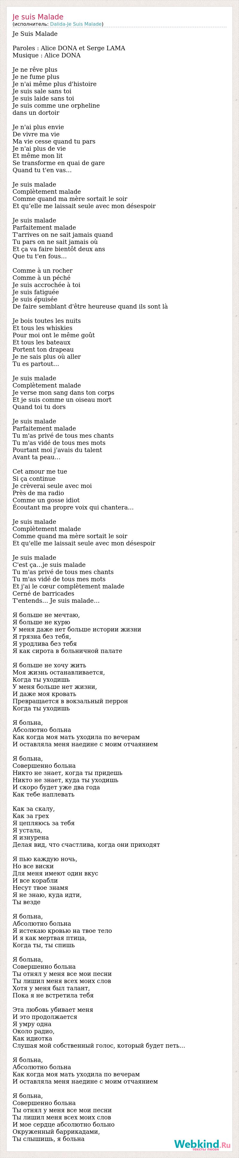 Je Suis Malade Paroles : Alice DONA et Serge LAMA Musique : Alice DONA Je ne rêve plus Je ne fume plus Je n'ai même plus d'histoire Je suis sale sans toi Je suis laide sans toi Je suis comme une orpheline dans un dortoir Je n'ai plus envie De vivre ma vie Ma vie cesse quand tu pars Je n'ai plus de vie Et même mon lit Se transforme en quai de gare Quand tu t'en vas… Je suis malade Complètement malade Comme quand ma mère sortait le soir Et qu’elle me laissait seule avec mon désespoir Je suis malade Parfaitement malade T'arrives on ne sait jamais quand Tu pars on ne sait jamais où Et ça va faire bientôt deux ans Que tu t'en fous… Comme à un rocher Comme à un péché Je suis accrochée à toi Je suis fatiguée Je suis épuisée De faire semblant d'être heureuse quand ils sont là Je bois toutes les nuits Et tous les whiskies Pour moi ont le même goût Et tous les bateaux Portent ton drapeau Je ne sais plus où aller Tu es partout… Je suis malade Complètement malade Je verse mon sang dans ton corps Et je suis comme un oiseau mort Quand toi tu dors Je suis malade Parfaitement malade Tu m'as privé de tous mes chants Tu m'as vidé de tous mes mots Pourtant moi j'avais du talent Avant ta peau… Cet amour me tue Si ça continue Je crèverai seule avec moi Près de ma radio Comme un gosse idiot Écoutant ma propre voix qui chantera… Je suis malade Complètement malade Comme quand ma mère sortait le soir Et qu'elle me laissait seule avec mon désespoir Je suis malade C'est ça…je suis malade Tu m'as privé de tous mes chants Tu m'as vidé de tous mes mots Et j'ai le cœur complètement malade Cerné de barricades T'entends… Je suis malade… Я больше не мечтаю, Я больше не курю У меня даже нет больше истории жизни Я грязна без тебя, Я уродлива без тебя Я как сирота в больничной палате Я больше не хочу жить Моя жизнь останавливается, Когда ты уходишь У меня больше нет жизни, И даже моя кровать Превращается в вокзальный перрон Когда ты уходишь Я больна, Абсолютно больна Как когда моя мать уходила по вечерам И оставляла меня наедине с моим отчаянием Я больна, Совершенно больна Никто не знает, когда ты придешь Никто не знает, куда ты уходишь И скоро будет уже два года Как тебе наплевать Как за скалу, Как за грех Я цепляюсь за тебя Я устала, Я изнурена Делая вид, что счастлива, когда они приходят Я пью каждую ночь, Но все виски Для меня имеют один вкус И все корабли Несут твое знамя Я не знаю, куда идти, Ты везде Я больна, Абсолютно больна Я истекаю кровью на твое тело И я как мертвая птица, Когда ты, ты спишь Я больна, Совершенно больна Ты отнял у меня все мои песни Ты лишил меня всех моих слов Хотя у меня был талант, Пока я не встретила тебя Эта любовь убивает меня И это продолжается Я умру одна Около радио, Как идиотка Слушая мой собственный голос, который будет петь... Я больна, Абсолютно больна Как когда моя мать уходила по вечерам И оставляла меня наедине с моим отчаянием Я больна, Совершенно больна Ты отнял у меня все мои песни Ты лишил меня всех моих слов И мое сердце абсолютно больно Окруженный баррикадами, Ты слышишь, я больна